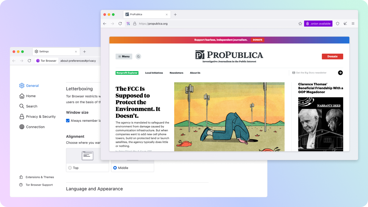 For desktop, we're continuing our efforts to improve the user experience of Tor Browser's fingerprinting protections. Following the changes we introduced to new window sizes in Tor Browser 13.0 for Desktop, this release features welcome design changes to letterboxing, including new options to remember your last used window size and adjust the alignment of the letterbox in General Settings. Bridge users will also discover a myriad of improvements to bridge settings, including a complete redesign of bridge cards with improved sharing features, and a new section designed to help you find more bridges elsewhere. Lastly, the design of onion site errors has received a visual refresh aimed at making them consistent with the other kinds of Network Errors you can find in Tor Browser.