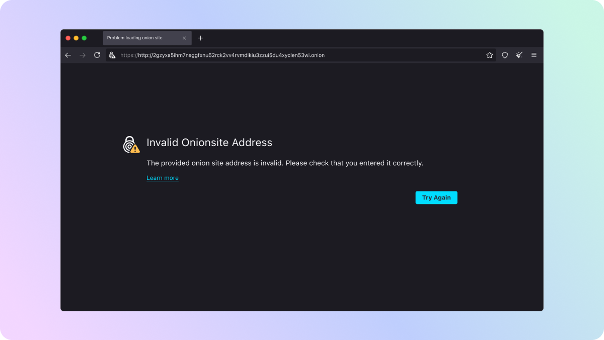 For the last few years onion site errors have appeared different from other types of neterrors in Tor Browser. Although the design decisions behind this change were well intentioned, they sometimes led to confusion about the source of the issue. In response, we've simplified the design of our onion site errors and made the user experience consistent with other types of neterrors you may encounter while you surf the onionverse.