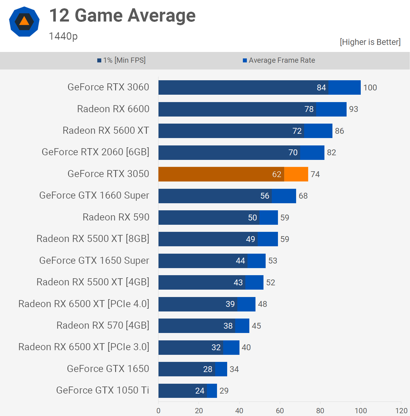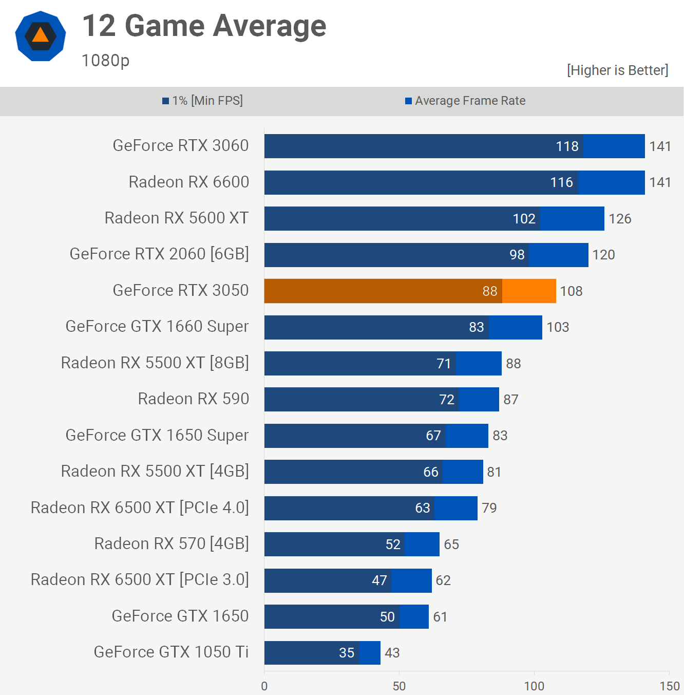 And here's a look at the 12 game average data, which has been calculated using the geomean. The RTX 3050 averaged 108fps at 1080p, which made it just 5% slower than the GTX 1660 Super, 10% slower than the RTX 2060, and 23% slower than the Radeon RX 6600.