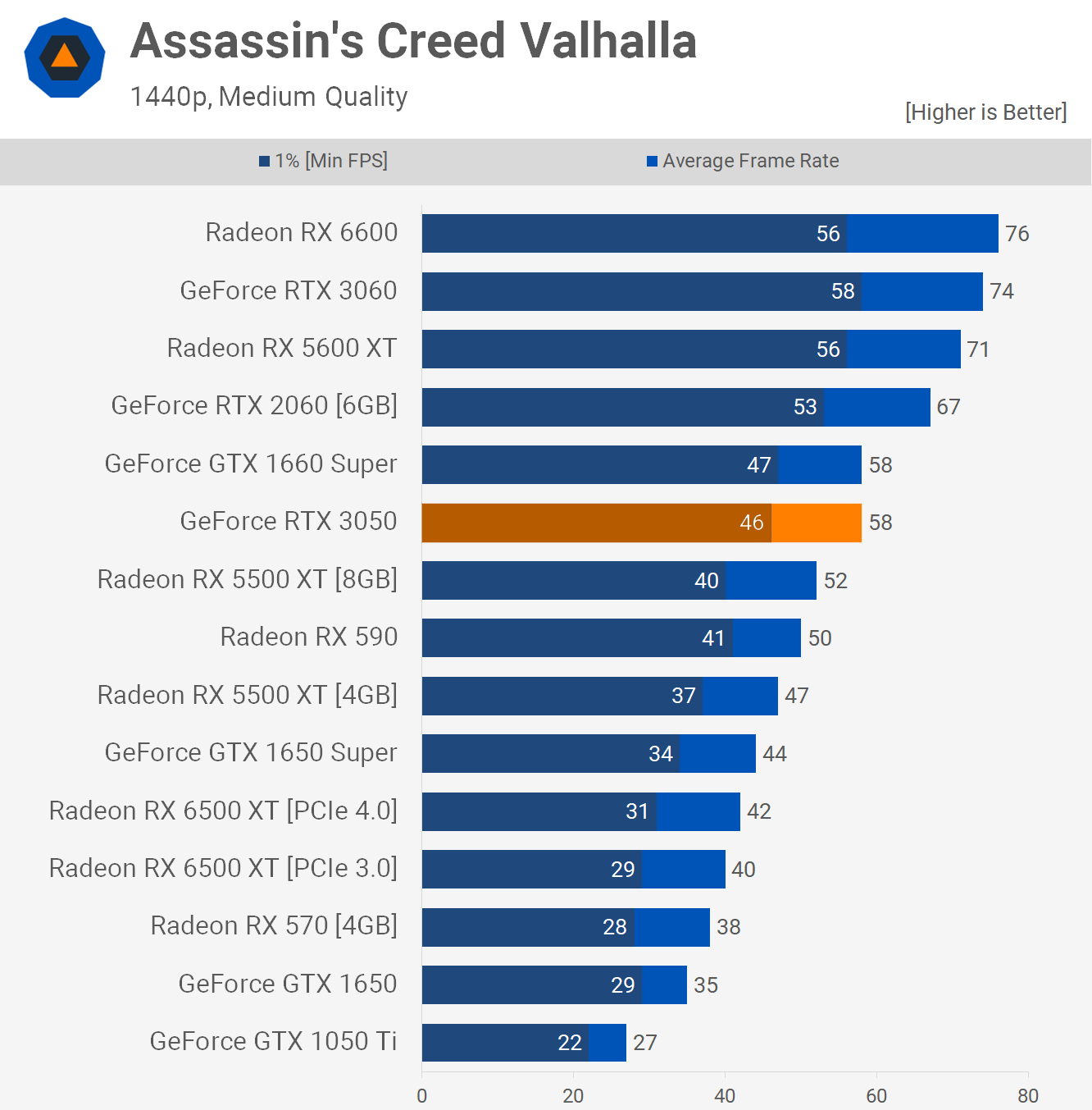 Starting with Assassin's Creed Valhalla, using the medium quality preset at 1080p, we find that the RTX 3050 is good for 79 fps on average, so here it's basically a GTX 1660 Super. That made it 18% faster than the 6500 XT using PCIe 4.0, and 30% faster when compared to the PCIe 3.0 configuration. It was also only 8% slower than the RTX 2060, a decent result overall.