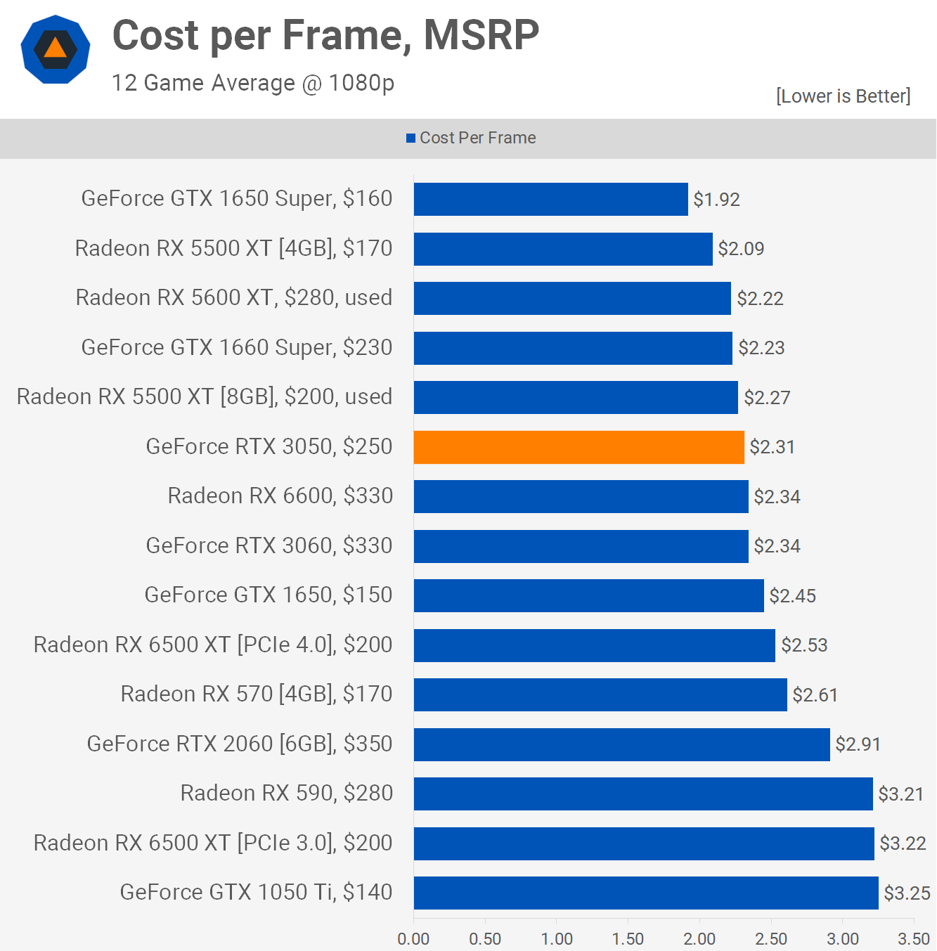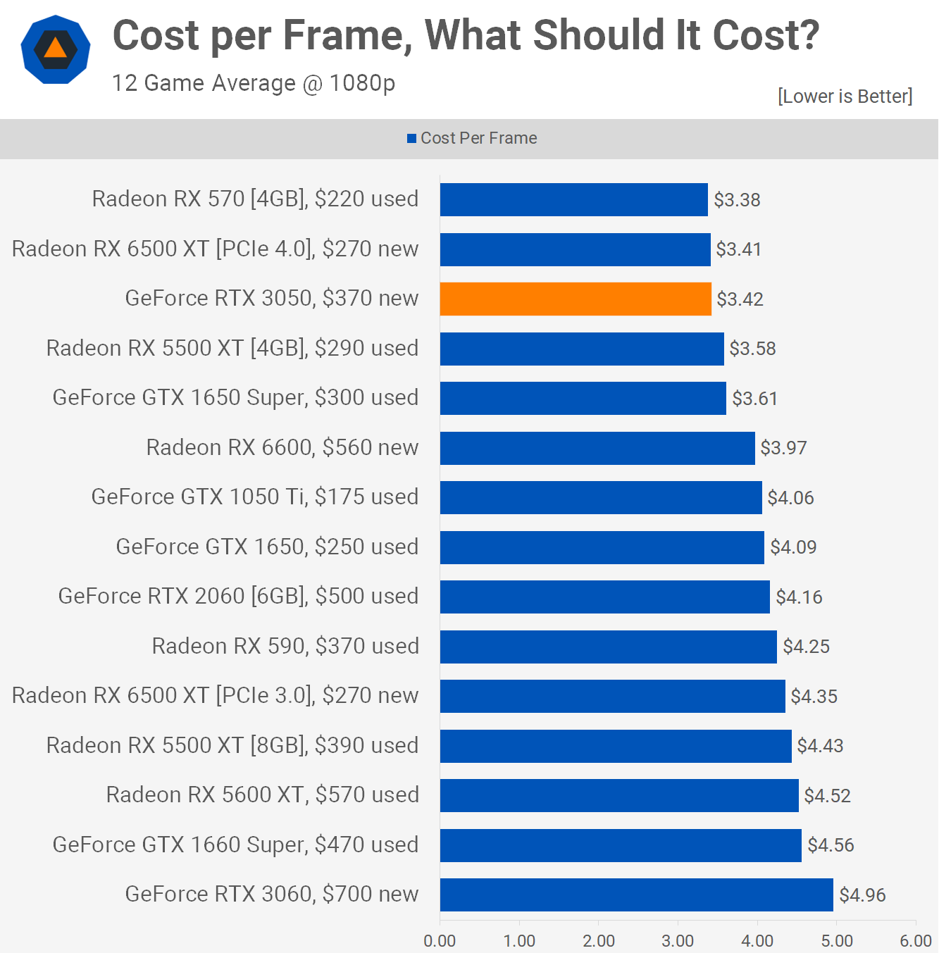 Even at $450, the RTX 3050 is better value for PCIe 3.0 owners as it reduces the cost per frame when compared to the 6500 XT (PCIe 3.0) by 4%, while including a number of important features.