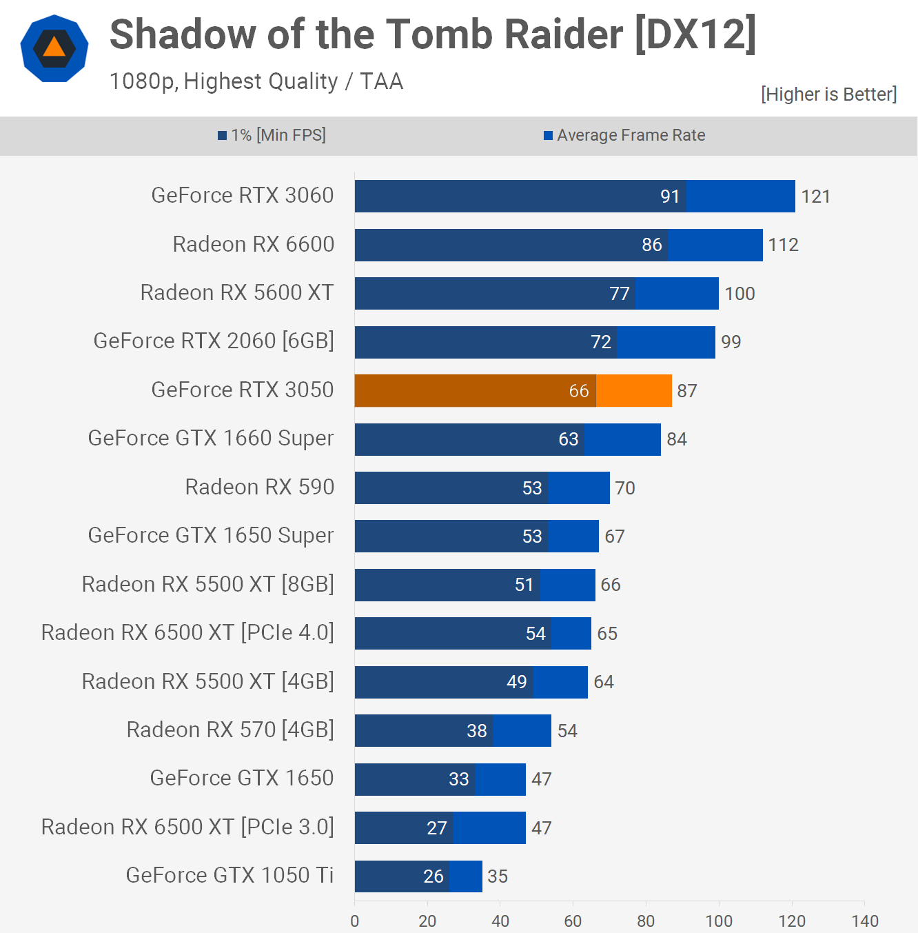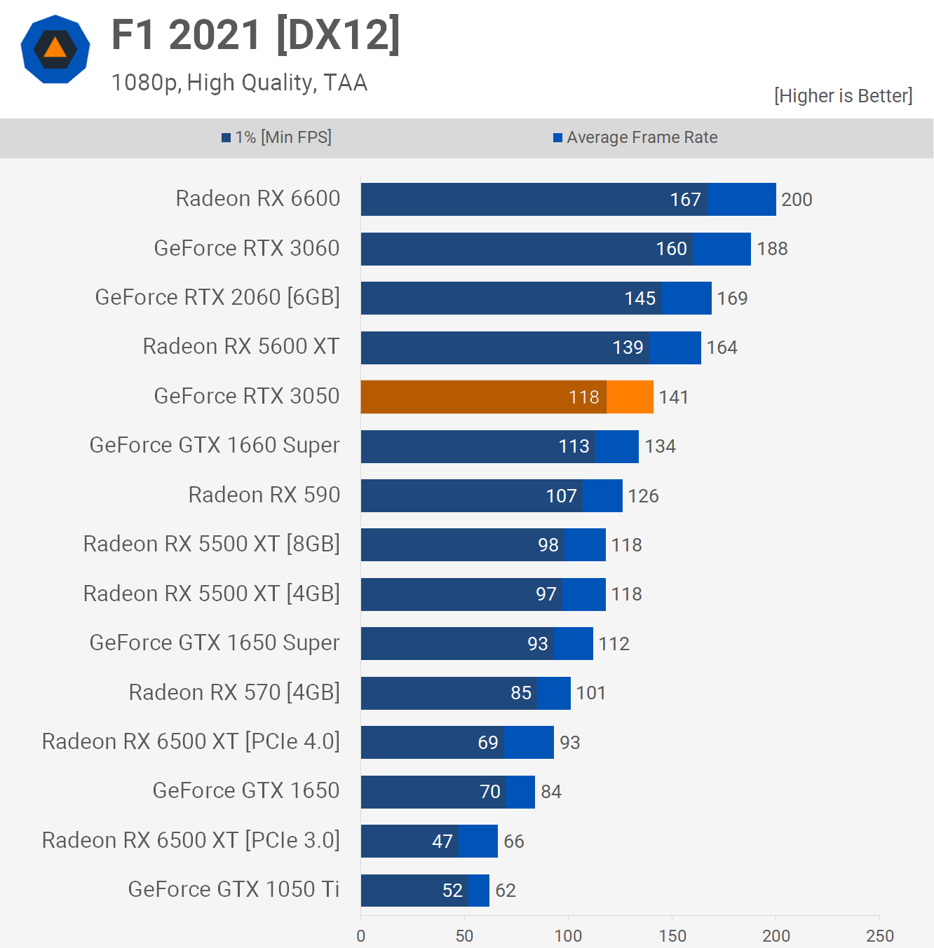 The RTX 3050 had no such issues though, pumping out a super impressive 130 fps while keeping 1% lows above 100 fps. It was also 13% faster than the RTX 2060 and just 11% slower than the RX 6600. A stellar result there.