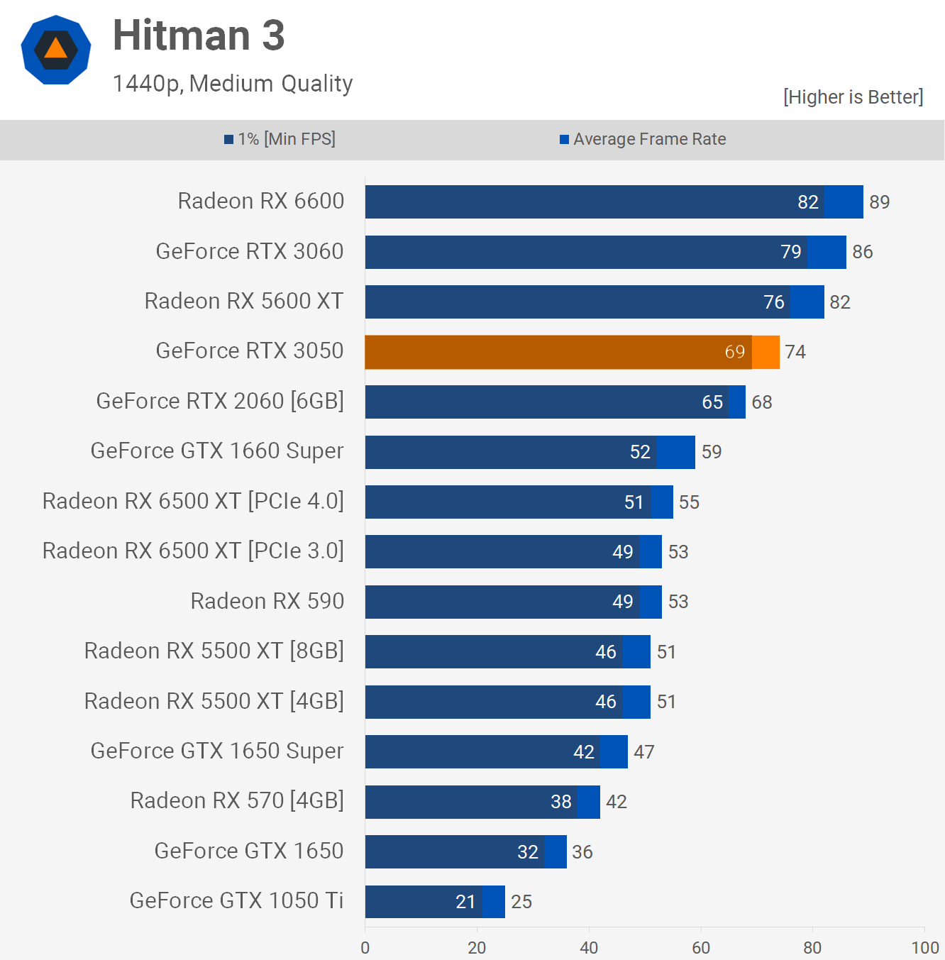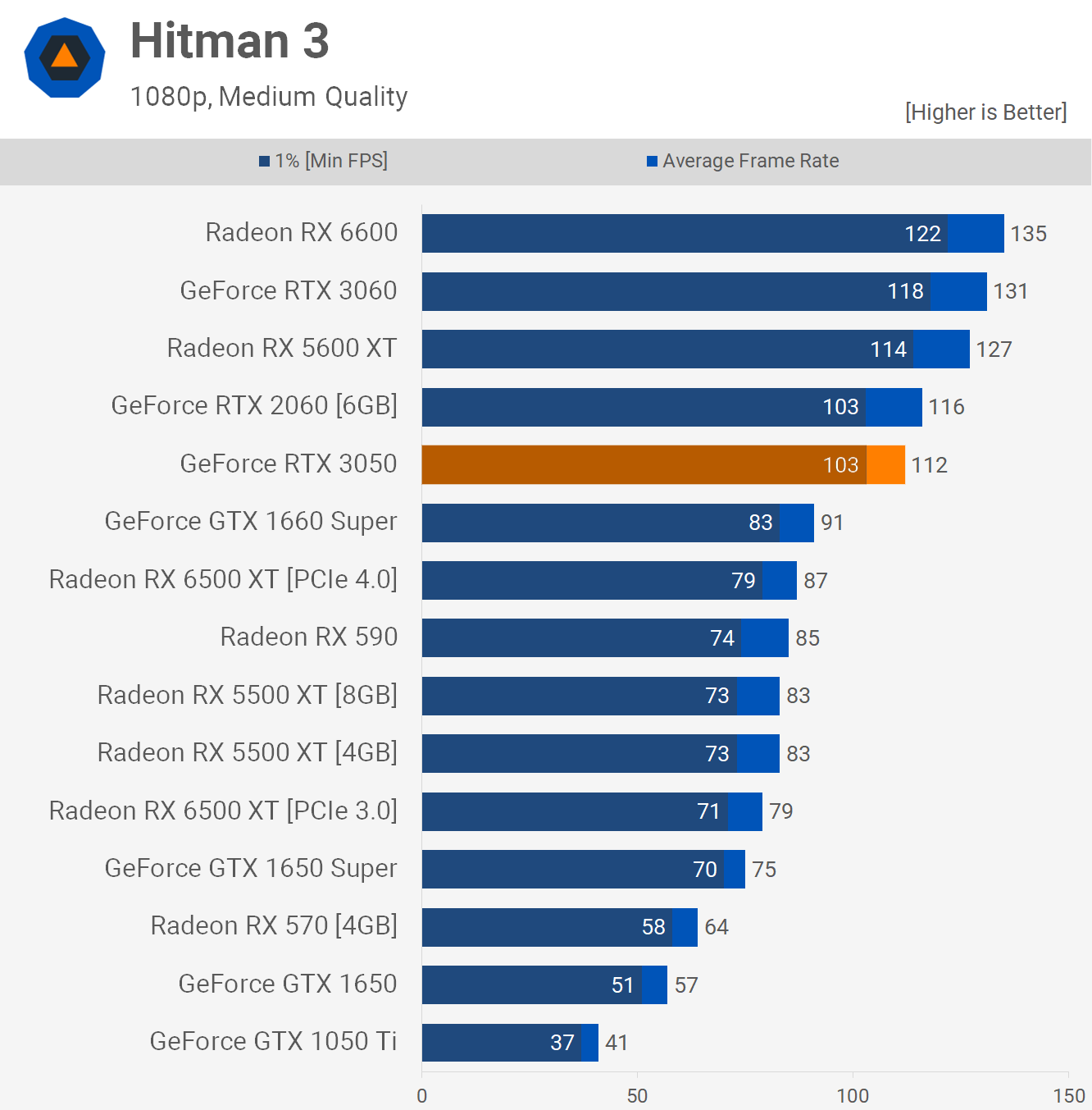 The RTX 3050 rendered 112 fps on average in Hitman 3 using the medium quality preset at 1080p and that placed it very close to the RTX 2060, while beating the GTX 1660 Super by a 23% margin. It was also 29% faster than the 6500 XT, or 42% faster when restricted to PCIe 3.0.