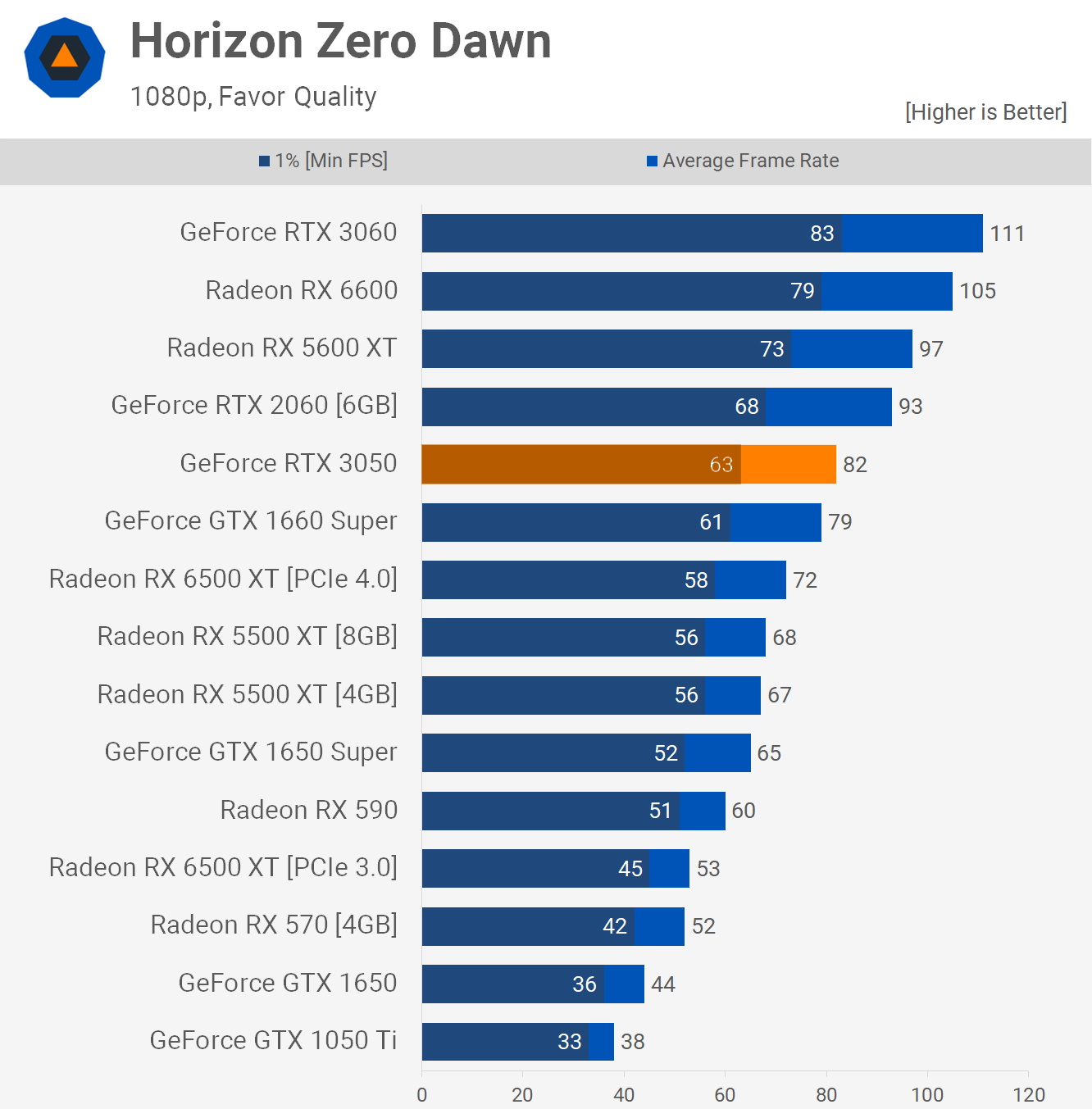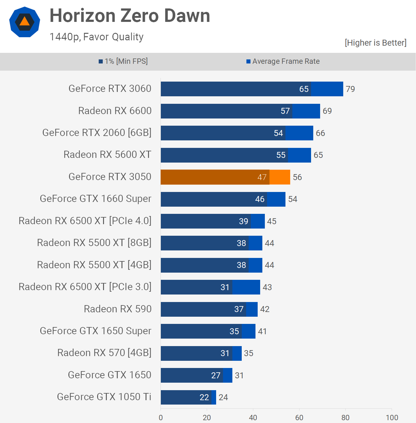 Next we have Horizon Zero Dawn where the 6500 XT using PCIe 4.0 did well relative to most other games with 72 fps on average. The RTX 3050 was 14% faster, though with both using PCIe 3.0 the GeForce GPU would be a massive 55% faster.