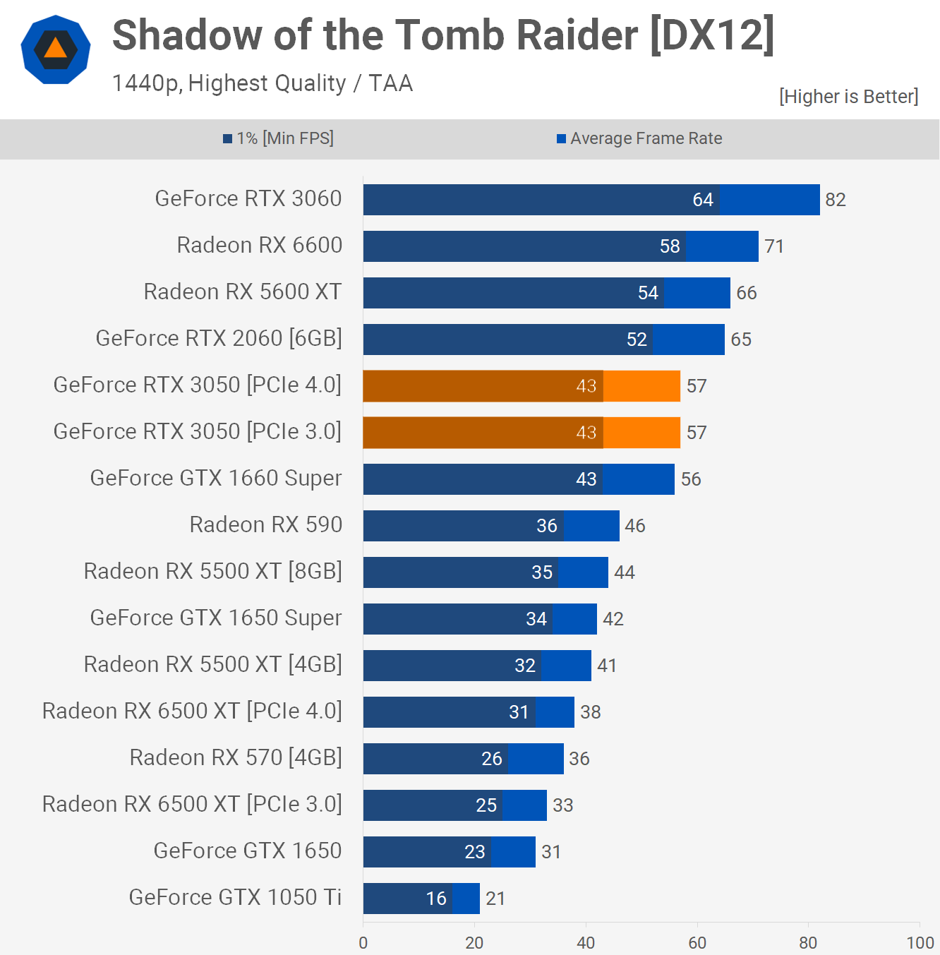 Although we've mentioned that the RTX 3050 delivers the exact same level of performance using PCIe 3.0 or PCIe 4.0, here's a quick sample of this. We tested all 12 games and found nothing outside the margin of error, though most results were exactly the same as shown below in Tomb Raider at 1440p.