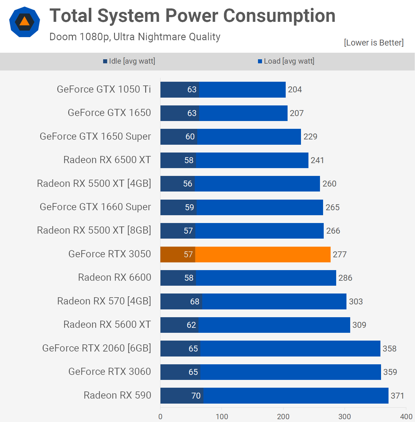 The GeForce RTX 3050 is very light on power, pushing total system usage to just 277 watts in our Doom benchmark. Considering the performance output, that makes it much more efficient than the 6500 XT, but even if we take a more favorable game such as Death Stranding or Hitman 3, the RTX 3050 still stacks up well as it only increased total system usage over the 6500 XT by 15%.