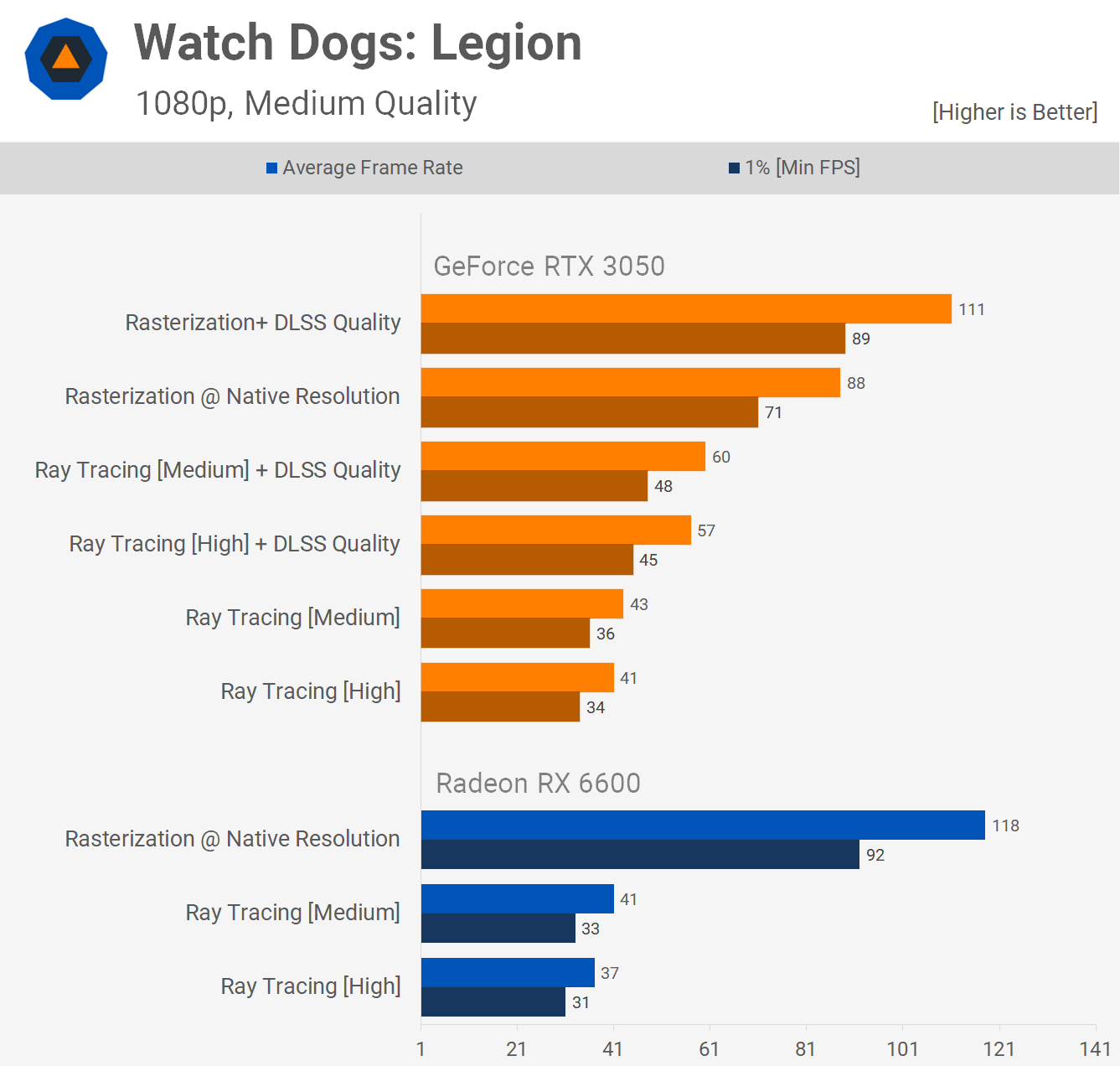 Starting with Watch Dogs Legion, we see that stock the RTX 3050 is good for 88 fps on average with the dialed down medium quality preset. Enabling DLSS without RT effects can be of big help, boosting the average frame rate by 26% for 111 fps, and now we're looking at RX 6600-like performance.