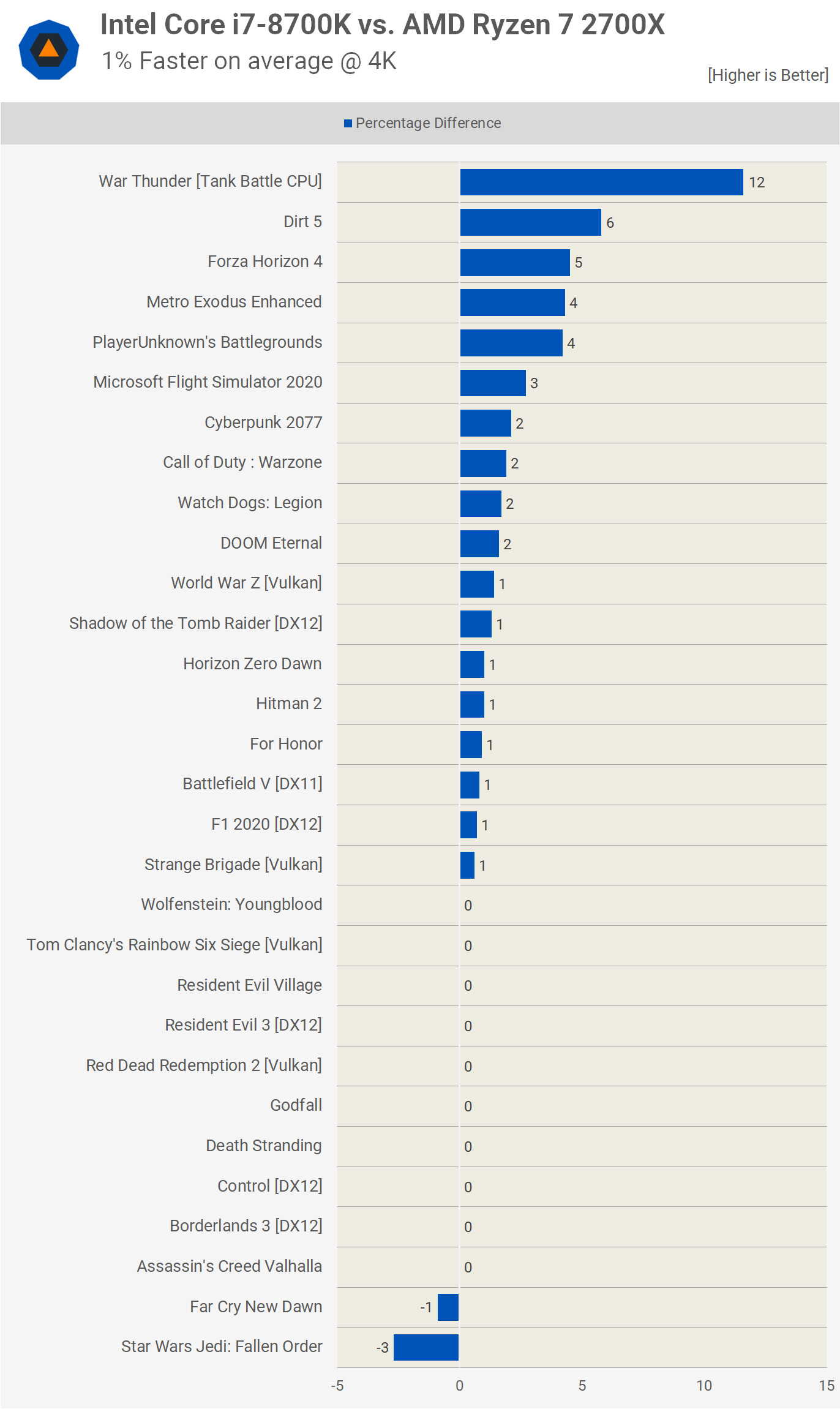 At 4K performance is very similar across the board. Here the 8700K was just 1% faster on average thanks to some decent wins in War Thunder and Dirt 5. But overall we are heavily GPU bound at 4K, even with the 6900 XT, so CPU performance was irrelevant.