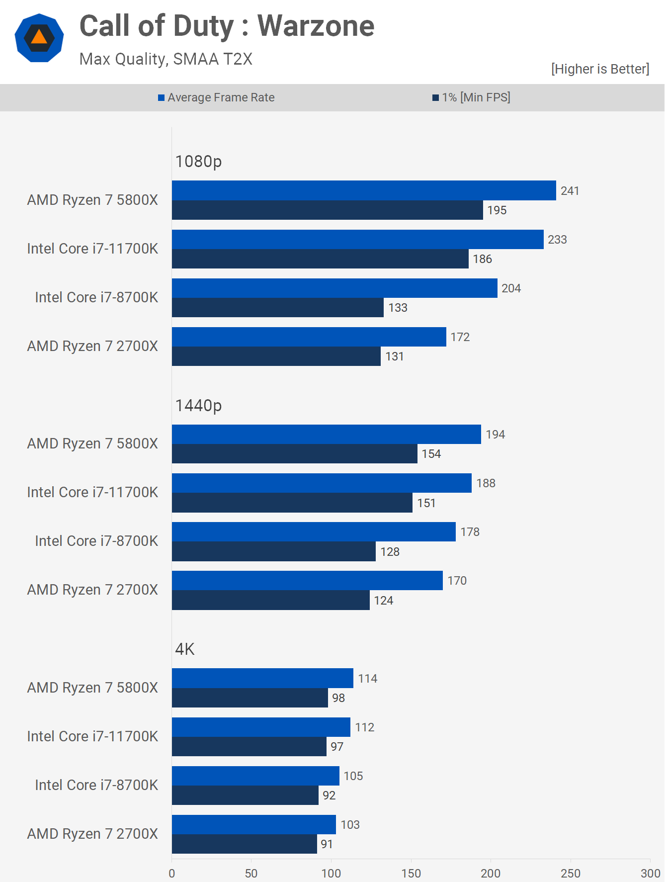 The Call of Duty Warzone performance is interesting because although the 8700K was almost 20% faster when comparing the average frame rate at 1080p, the 1% low performance was about the same. Then at 1440p there's very little difference between these two CPUs and that being the case we see no real difference at 4K.