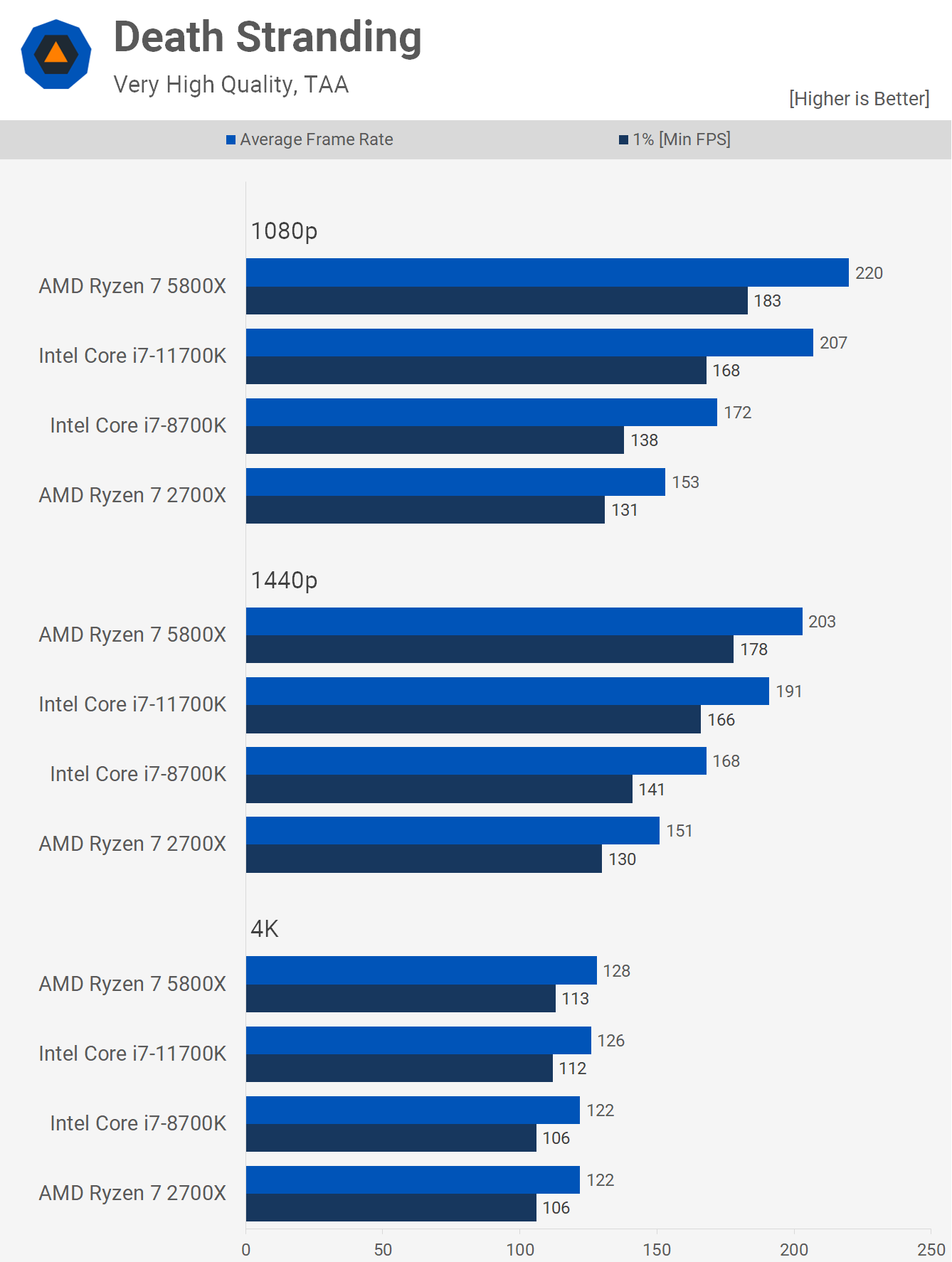 The Core i7-8700K was clearly faster in Death Stranding, offering around 12% more performance at 1080p and 1440p, but with the 2700X pushing over 144 fps at both resolutions, this isn't a margin you're going to notice in this title. The 2700X also looked a lot better next to the 8700K than it does against the newer 11700K and 5800X.