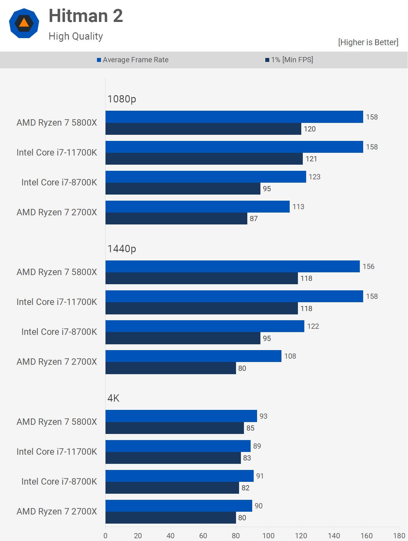In Hitman, the 2700X looks quite poor relative to the newer 5800X and 11700K, trailing by almost 30%. However, when compared to the 8700K, the 2700X was just 8% slower at 1080p and 11% slower at 1440p, so the margin wasn't that extreme in that older generation comparison.
