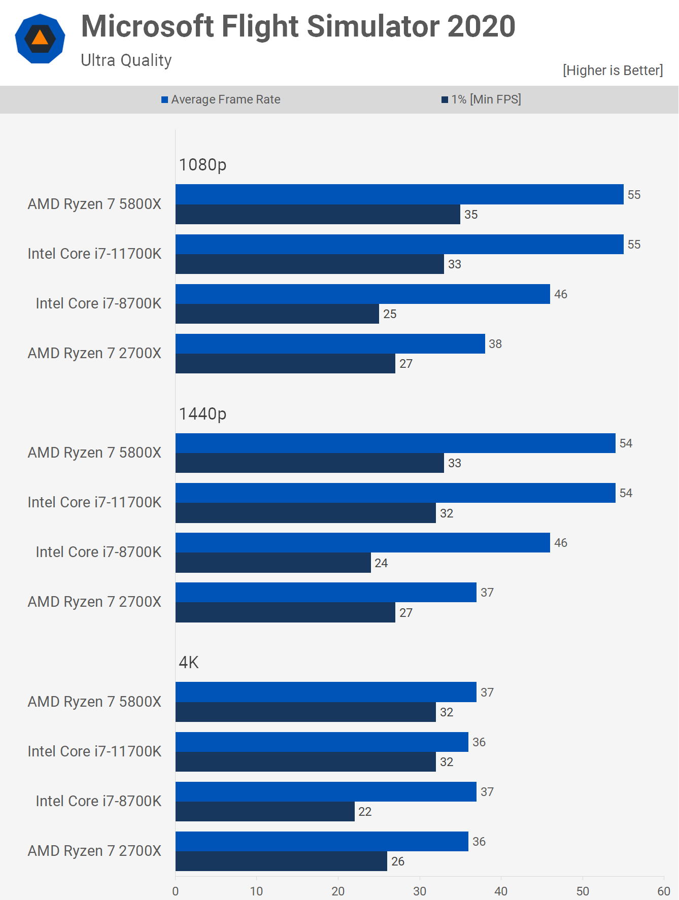 Microsoft Flight Simulator 2020 is still heavily thread dependant and as a result the 8700K enjoys a handy lead over the 2700X, delivering 21% more performance on average at 1080p and 1440p, though it's worth noting that the Ryzen 7 part does enable slightly better 1% low performance, and of course, frame rates were much the same at 4K.