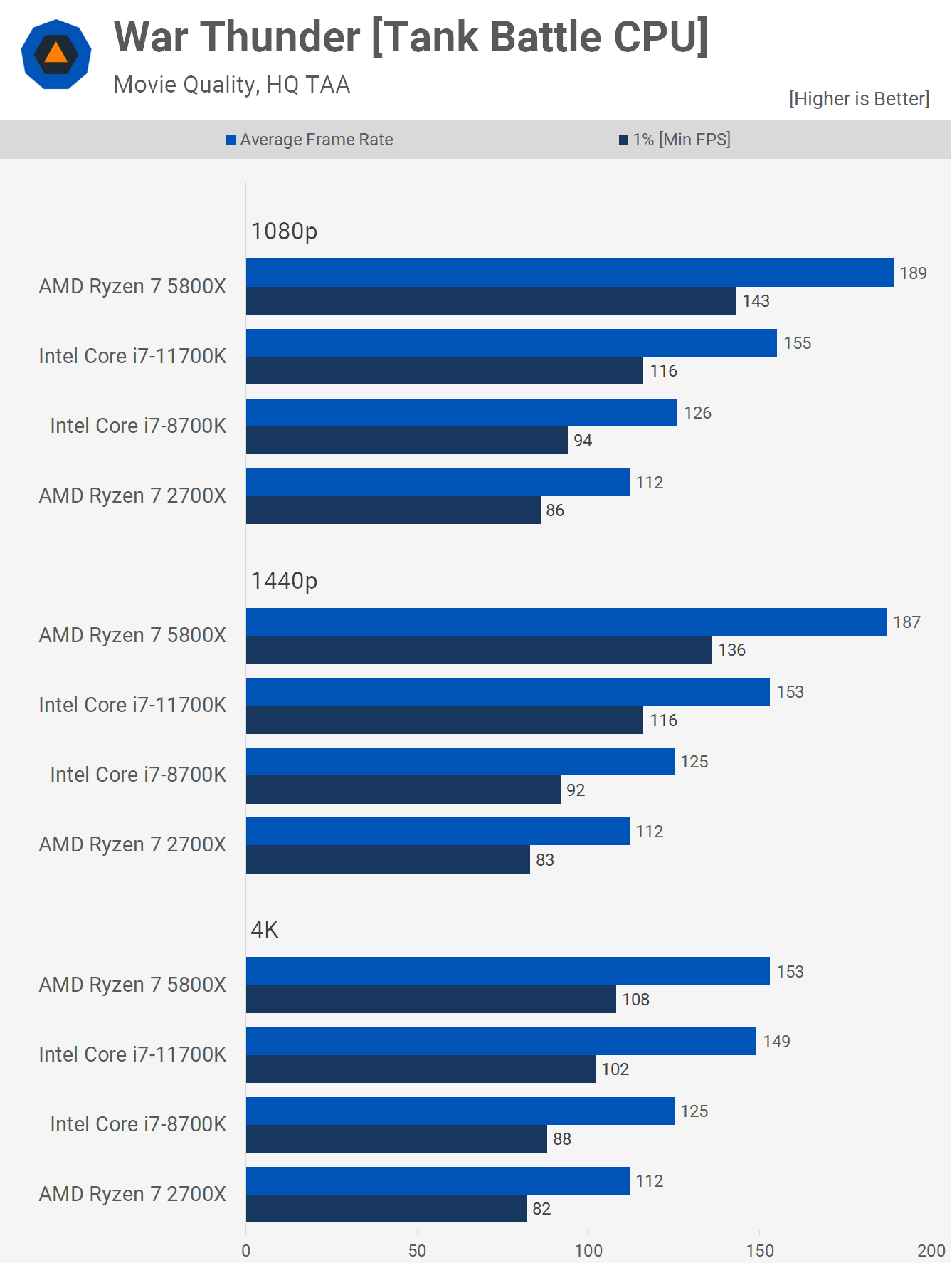 Performance in War Thunder was particularly poor for the 2700X relative to the new 8-core AMD and Intel CPUs, but not to say the experience was poor, quite the contrary as the game was smooth and enjoyable at 112 fps, it's just that relative to the 5800X it was just over 40% slower. However, relative to the 8700K things look better for the old Ryzen 7 part, as here it was only 11% slower. That margin was seen at all three tested resolutions as the 2700X and 8700K were the primary performance limiting components in this testing.