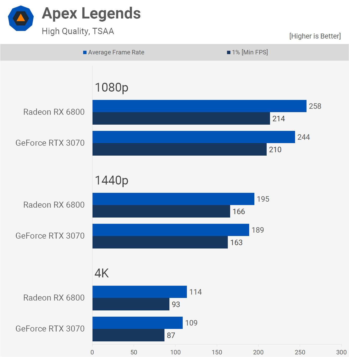 In Apex Legends we're looking at very similar performance with either GPU. The RX 6800 is just 6% faster at 1080p, 3% faster at 1440p and up to 5% faster at 4K. The margins are slim in this title, making the GeForce the more attractive option.