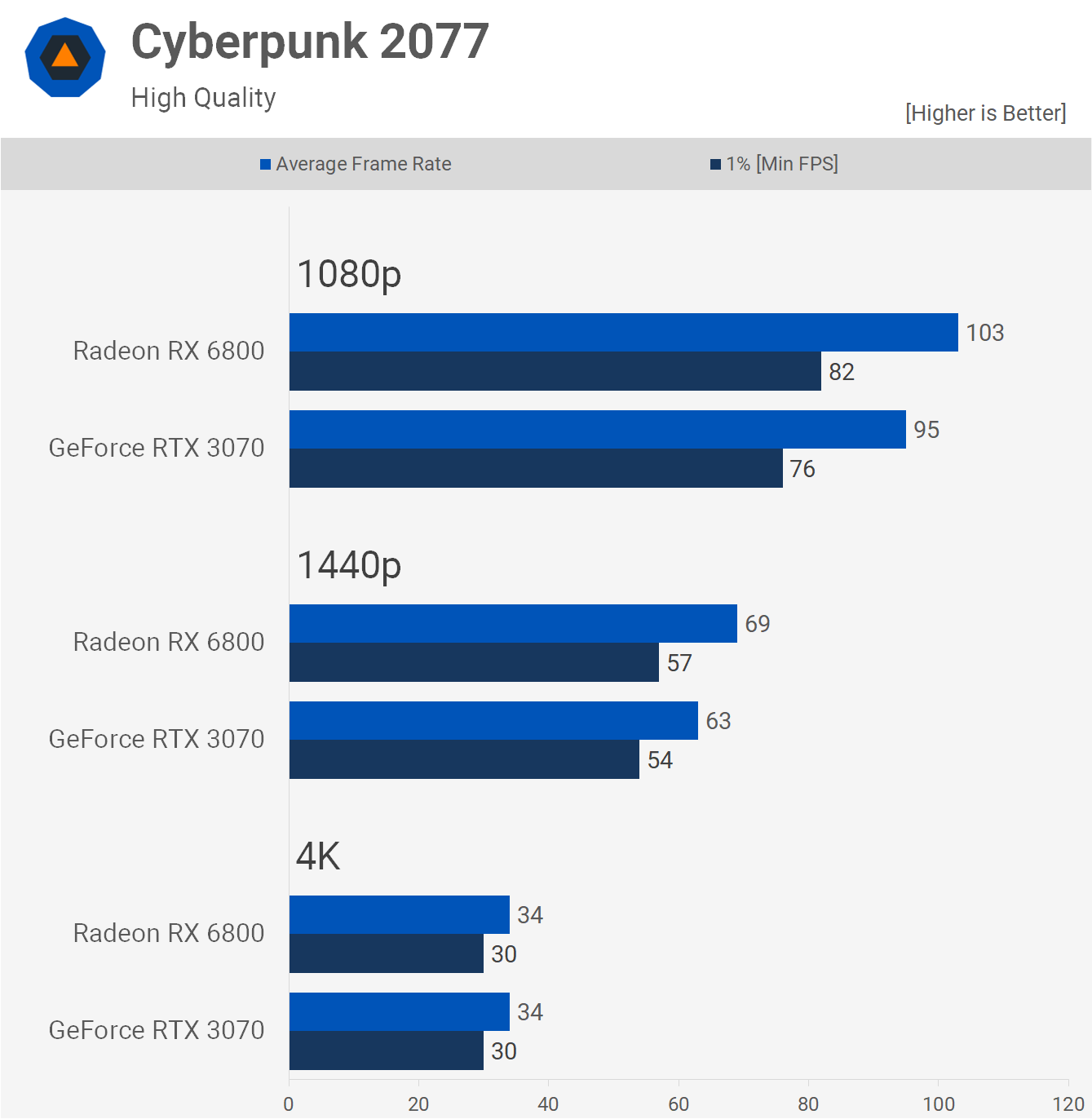 At 1080p we find that the Radeon RX 6800 is 8% faster and then 10% faster at 1440p, while we're looking at identical performance at 4K. Now you can enable DLSS with the RTX 3070 for greater performance, something we'll discuss more about later in the article.
