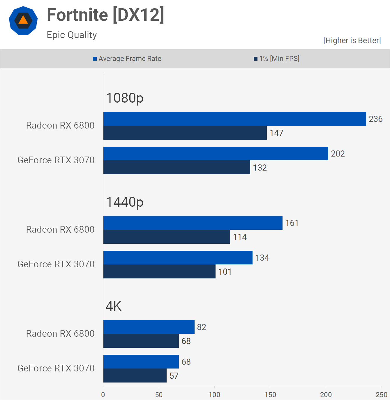 Next up is Fortnite performance, a game that didn't run as well on Radeon GPUs. AMD put in the work to fix performance in this title and as you can see the RX 6800 series is very competitive, beating the 3070 by a 17% margin at 1080p, 20% at 1440p and 21% at 4K. Given the price difference however those margins hardly make the GeForce GPU a poor value choice.