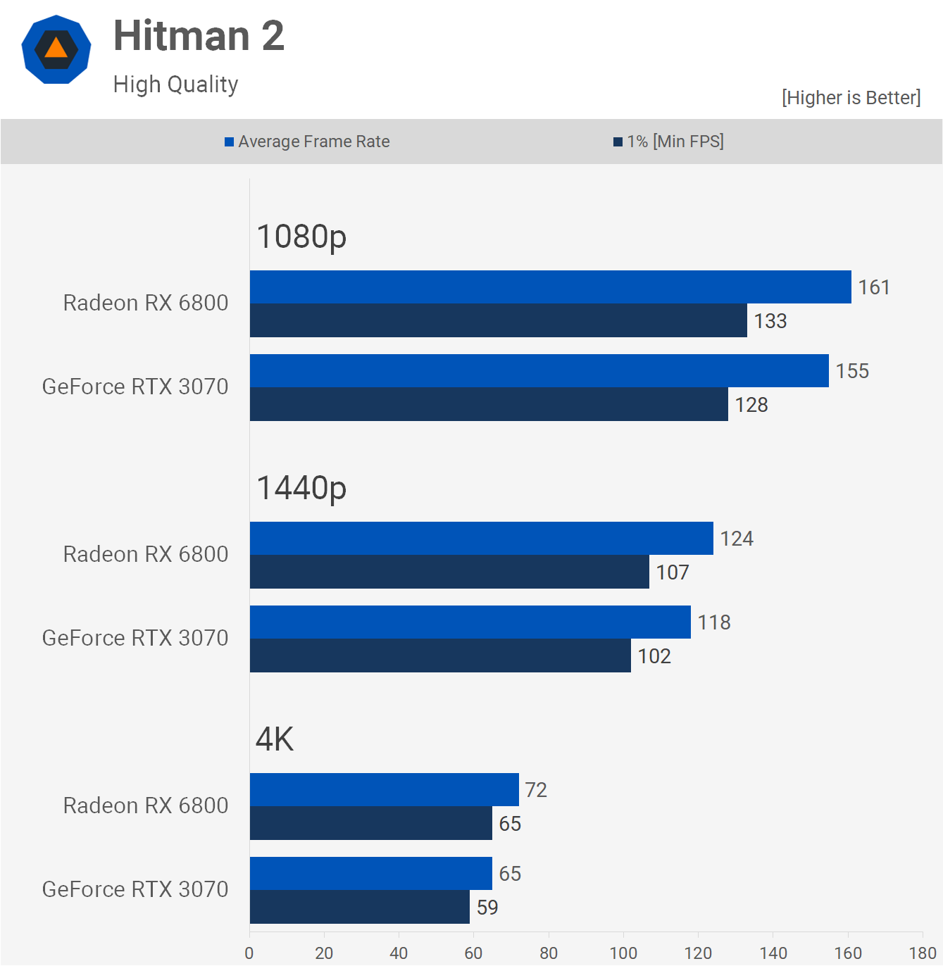 Moving to Hitman 2 we find that the Radeon RX 6800 is far less impressive in this title and although it still manages to beat the RTX 3070 in all tested resolutions, the margins are lower than the price premium. For example, at 1080p the Radeon GPU was just 4% faster, 5% faster at 1440p and 11% faster at 4K. As the resolution scales and we become more GPU bound, the RX 6800 performs better, but even the 11% margin at 4K isn't terribly impressive.