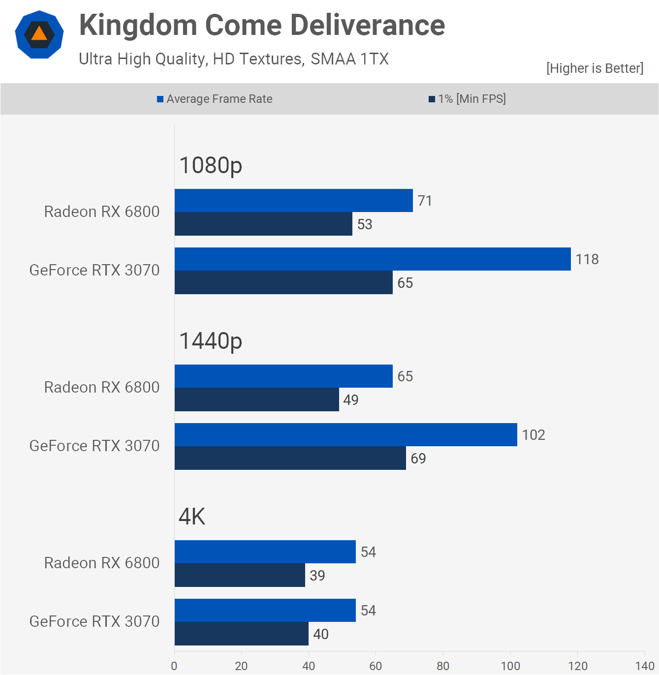 Starting with 1440p performance, we see that overall the RX 6800 is just 11% faster on average which is slightly lower than the 14% win it enjoyed in our day one review featuring 18 games. Of course, that review didn't include titles such as Kingdom Come Deliverance, World of Tanks, Warhammer Vermintide 2 and Star Wars Jedi Fallen Order.