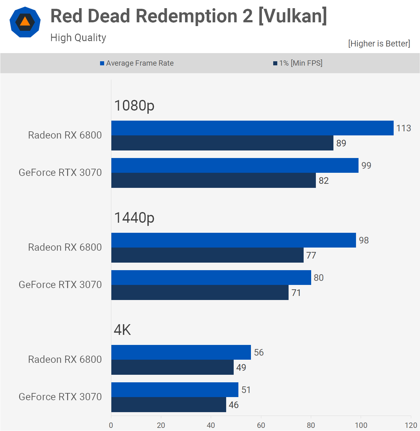 We tested Red Dead Redemption 2 in game (as opposed to using the built-in benchmark) and as you can see the RX 6800 was 14% faster at 1080p, though we wonder if we're running into some kind of system limitation that's not GPU related as that margin opens up quite considerably at 1440p. Here the Radeon was 23% faster but then things close right up at 4K to just a 10% margin in favor of the Radeon GPU, though that's not uncommon to see as the Ampere architecture is often better utilized at higher resolutions.