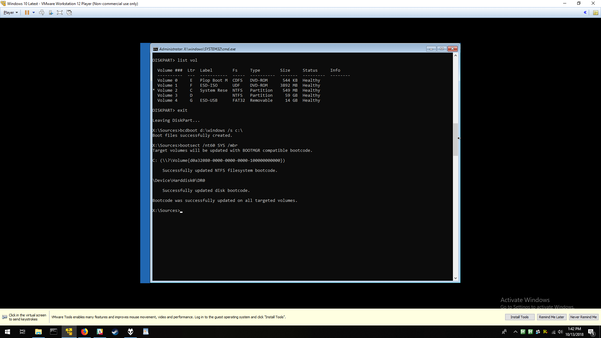- bcdboot C:\Windows (Recreates the system partition files with those copied from C:\Windows. While this format works from within Windows, see the note below about running this command from a recovery console outside of Windows).