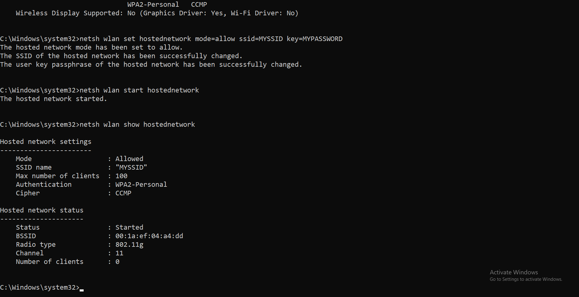 From there, you can enable the hotspot with this command: netsh wlan set hostednetwork mode=allow ssid=YOURSSID key=YOURPASSWORD