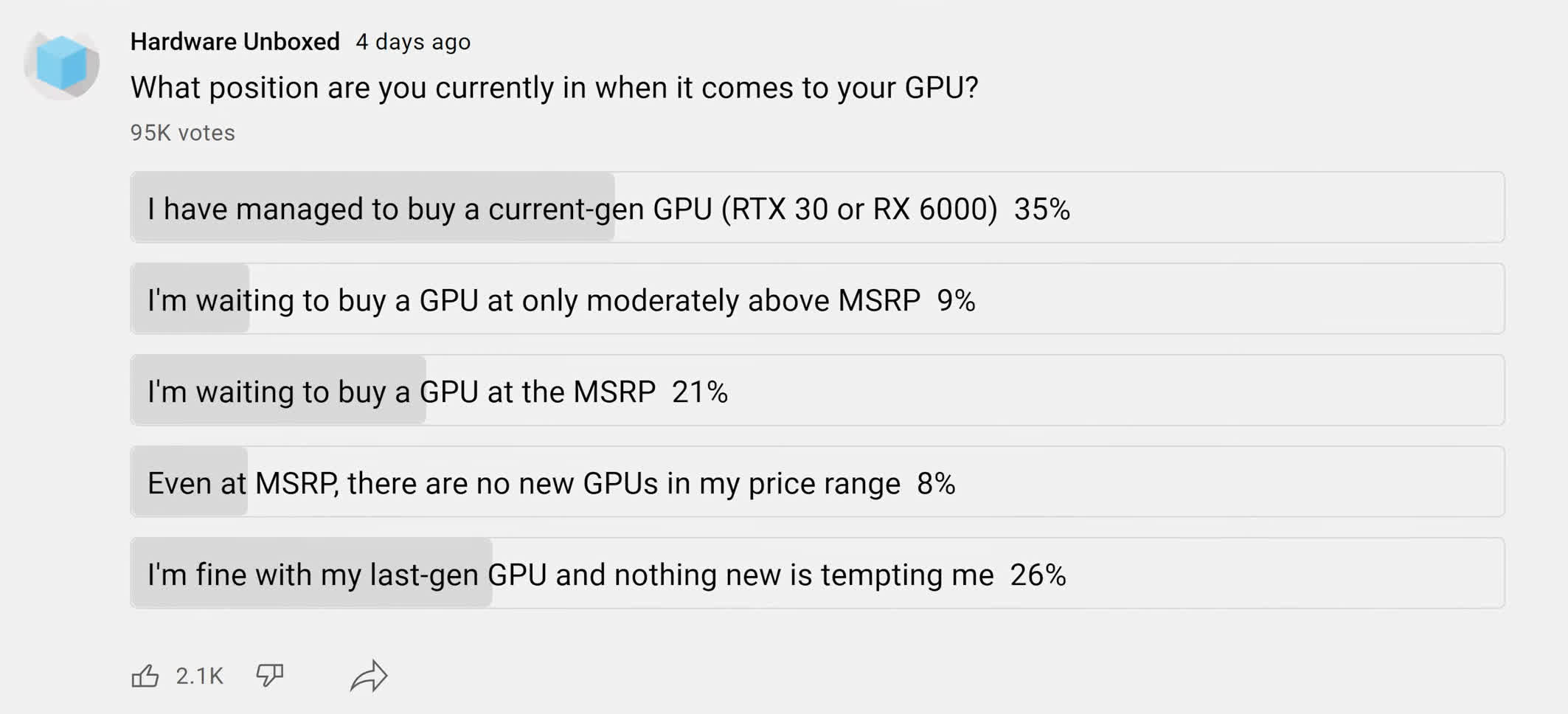 We also surveyed users about the position you are currently in with your GPU. A higher proportion than ever have said they have managed to buy a current-gen GPU. Of the respondents that do want to upgrade and aren't fine with their current GPU, just under half have been able to buy a new GPU, while around 40% are still waiting for price reductions. A further 11% of this group said there are no GPUs in their price range, indicating they are waiting for more entry-level cards to hit the market like a GeForce RTX 3050-type product.
