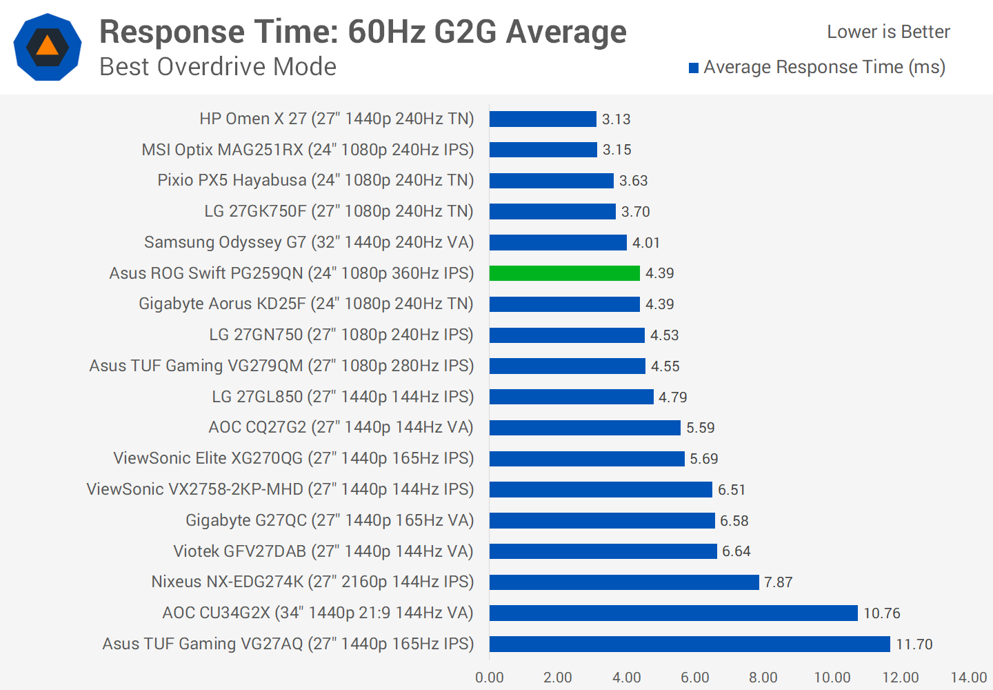 Most TN panels have a rated transition time of 1ms, or even lower with some recent releases. Actual grey to grey averages we've measured for TN panels tend to be in the 2-3 ms range when overdrive is factored in, which makes TN the fastest technology.