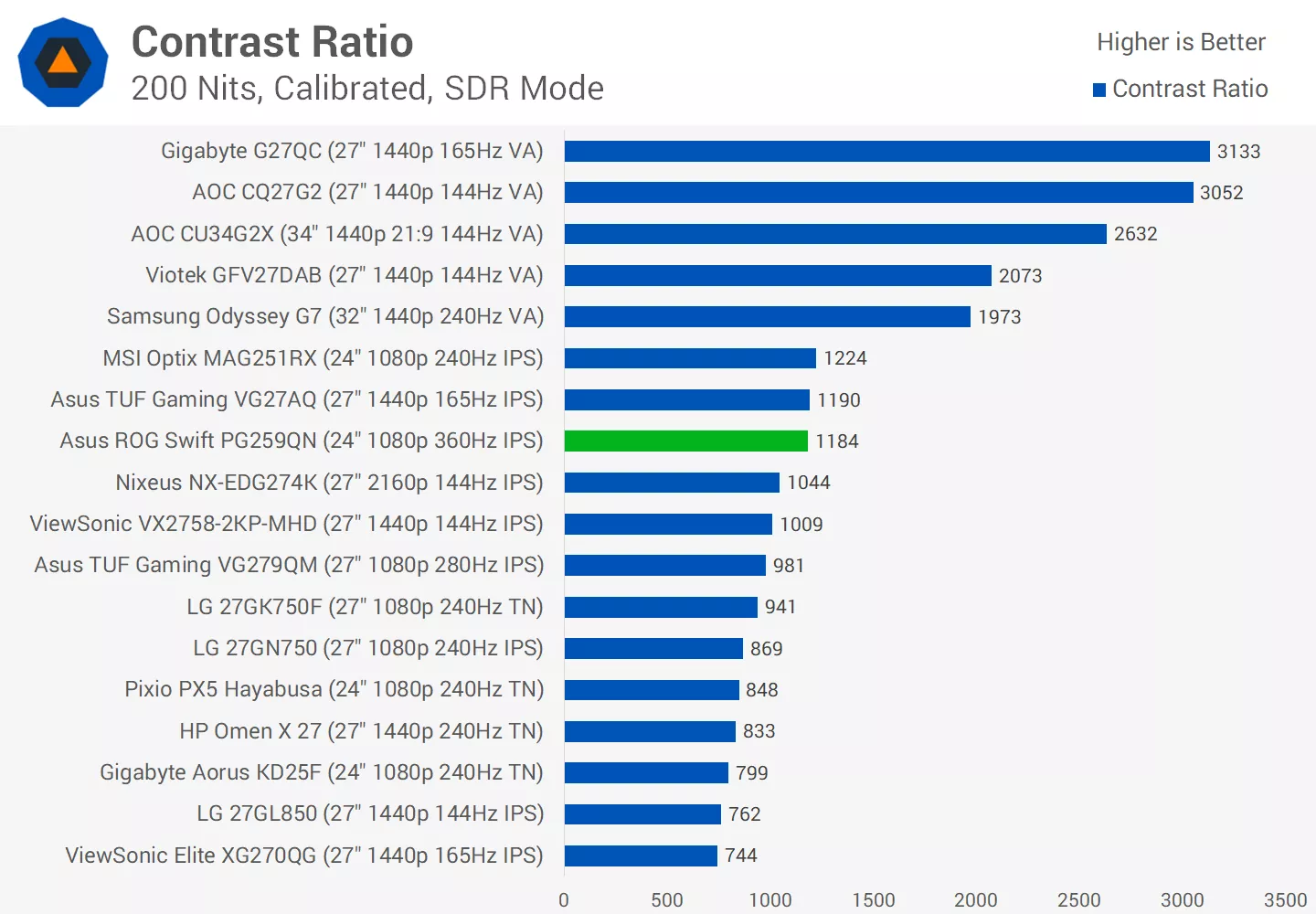 Neither TN nor IPS get to the range of VA though. Entry-level VA panels start with a contrast ratio of 2000:1 from those that we've tested, with the best easily exceeding 4500:1, although 3000:1 is a typical figure for most monitors.