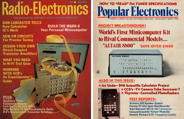 As noted, Intel's 8008 processor provided the impetus for Jonathan Titus to build his own computer. The resulting Mark-8 was featured in the July 1974 issue of Radio-Electronics Magazine in an article with assembly instructions and a list of parts manufacturers since the components had to be sourced by hobbyists. Not to be outdone, Popular Electronics would feature the Altair 8800 in its January 1975 issue.