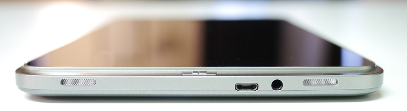 A tour of the perimeter reveals a microSD card slot, a micro-HDMI port and a volume rocker on the right side, a power button and power LED indicator across the top edge and a micro-USB connector (also used for charging), a 3.5mm headphone jack and dual speakers along the bottom. The left edge of the tablet remains untouched.