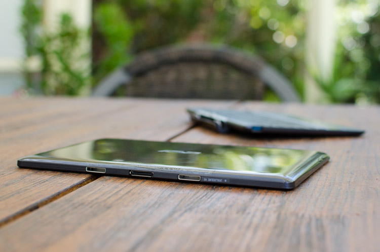 The left edge sees both a volume rocker and the relocated Windows button, the latter of which definitely feels like a mandatory Microsoft-forced inclusion (it is) rather than a thought-out, ergonomic placement. Along the top you'll find the power button to the left, while the right hand side has all the ports. The T100 gives you a micro-USB port, micro-HDMI port, exposed microSD card slot and 3.5mm audio jack.