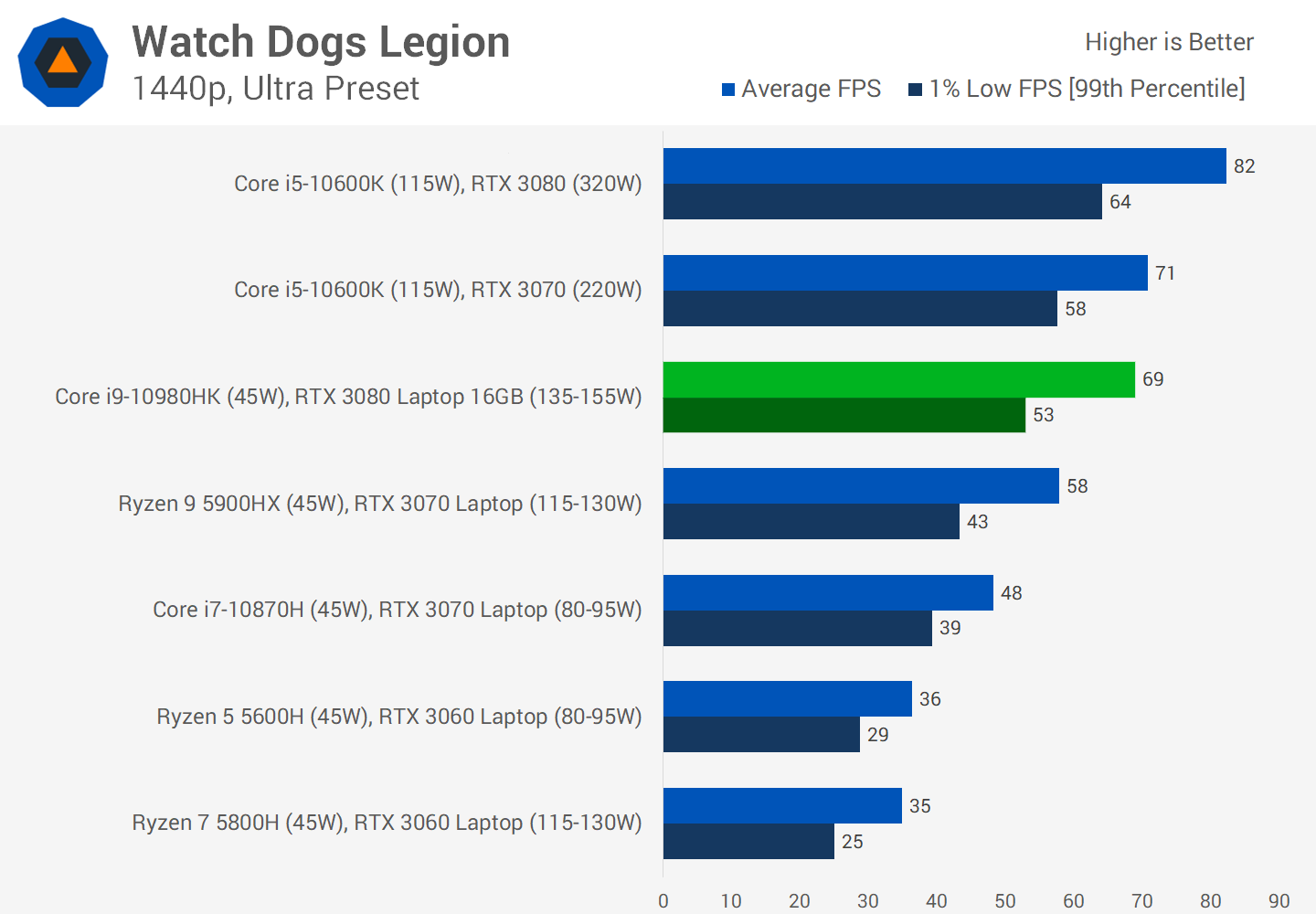 That margin is about the same at 1440p, the RTX 3080 Laptop is 25% slower than the RTX 3080 desktop variant.