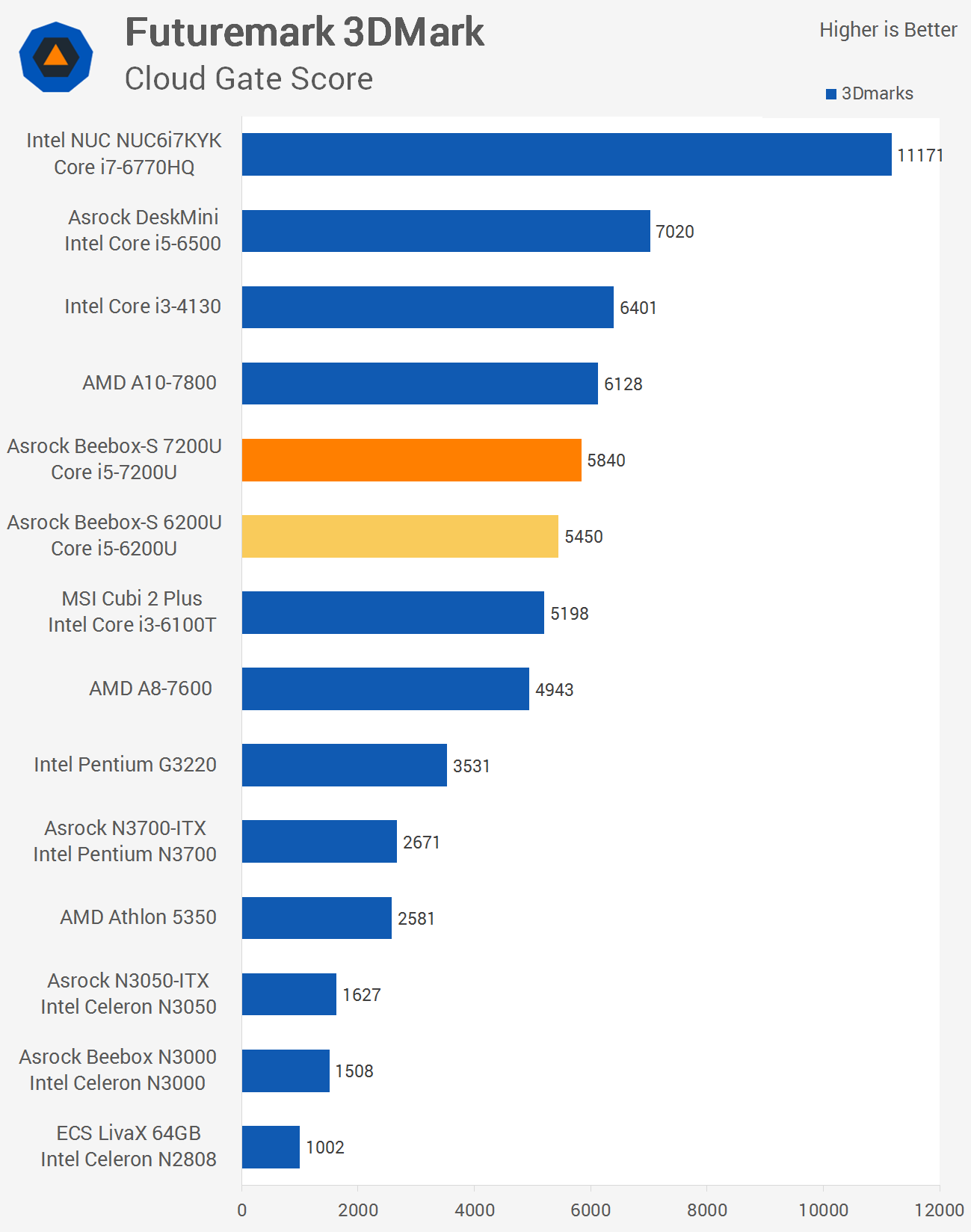 Going back to 3DMark 06 we find the Beebox-S 7200U is 16% faster than the older 6200U model. That's a decent boost and it placed the 7200U ahead of the AMD APU powered systems as well as the Core i3-4130.