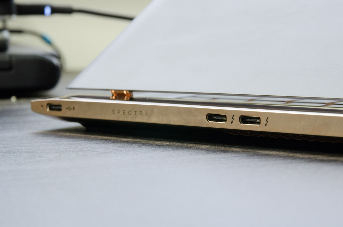 All ports on the Spectre are found along the back edge. This may not be the most convenient location while you're using the laptop, but it's clearly a trade-off to keep this device so slim. The Spectre only features USB Type-C ports along with a 3.5mm audio jack, although unlike Apple's MacBook, HP was clever enough to include three Type-C ports. So yes, you can easily charge this device and connect an accessory without the use of a dongle.