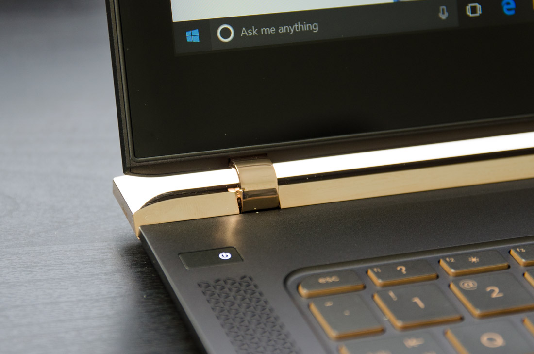 The two hinges slide carefully into a large gold section that occupies the entire rear edge of the Spectre. The glossy metal finish looks spectacular - it complements the rest of the metal body so well - but it is a huge fingerprint magnet and requires constant cleaning to look at its best. When you do clean it, along the back edge you'll find a subtle Spectre logo, which is one of my favorite aspects to the entire design; it just adds that little extra touch.