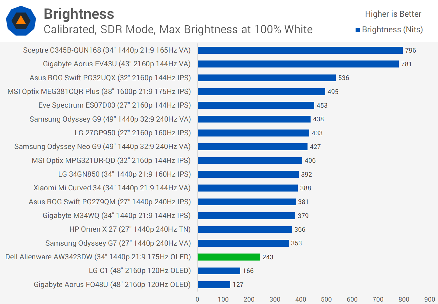 As far as SDR brightness goes, the AW3423DW is significantly better than other OLED displays we've measured, which are flat out hitting even 150 nits. This Alienware display remains relatively poor for peak brightness, but 240 nits is much better than the LG C1 and very usable in some indoor conditions, provided it's not too bright.