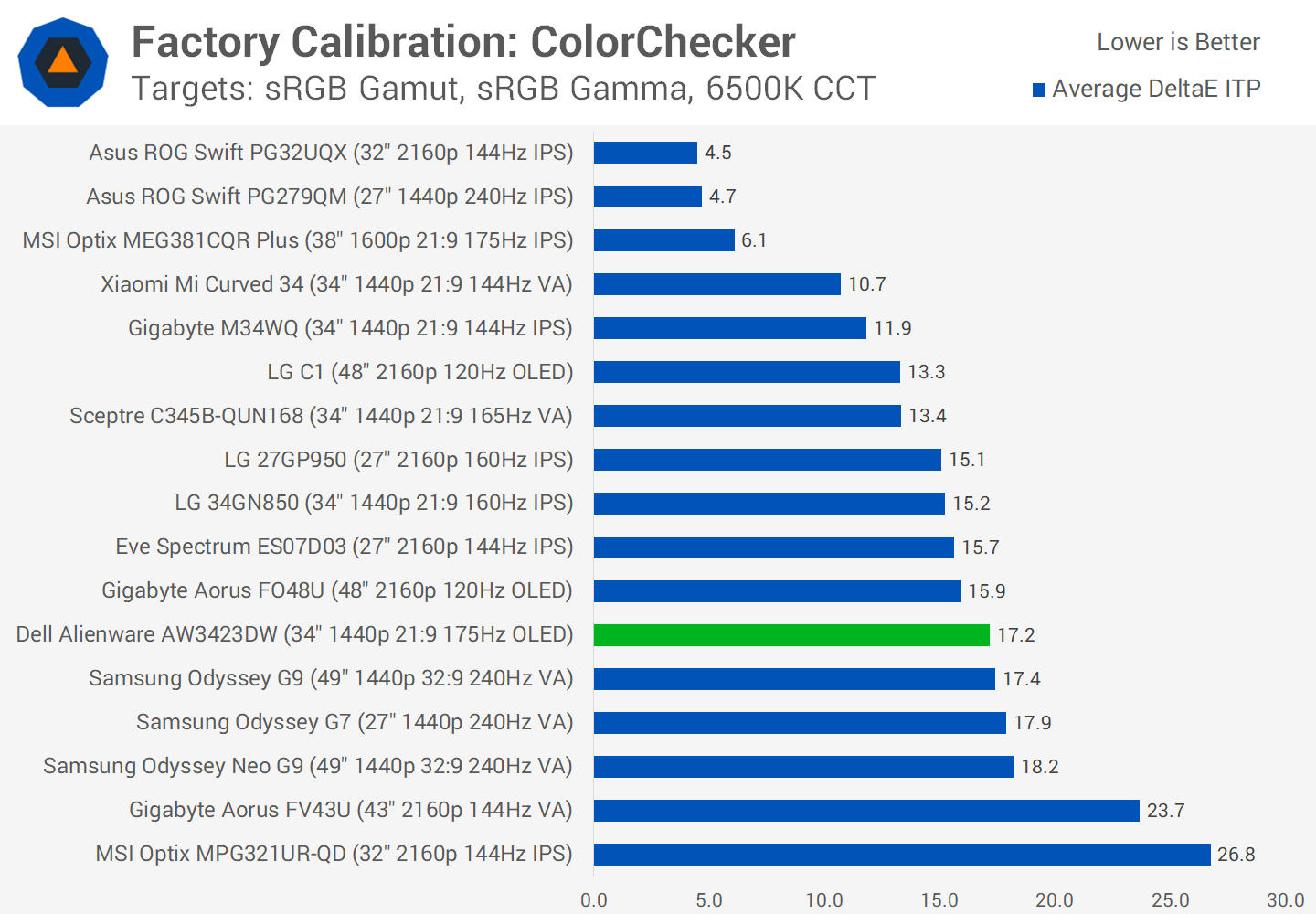 This checklist assesses whether Dell is accurately advertising this monitor's capabilities and whether the display meets basic acceptable performance metrics. In the opening section, the AW3423DW receives a deduction for only including HDMI 2.0, which limits the display to just 100Hz instead of the full 175Hz. However, it sails through color performance well, aside from the usual limitations to the sRGB mode. Dell does advertise factory calibration and the sRGB provided is mostly fine.