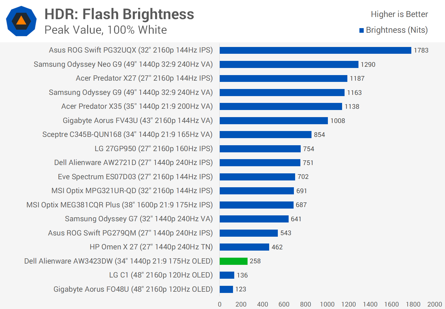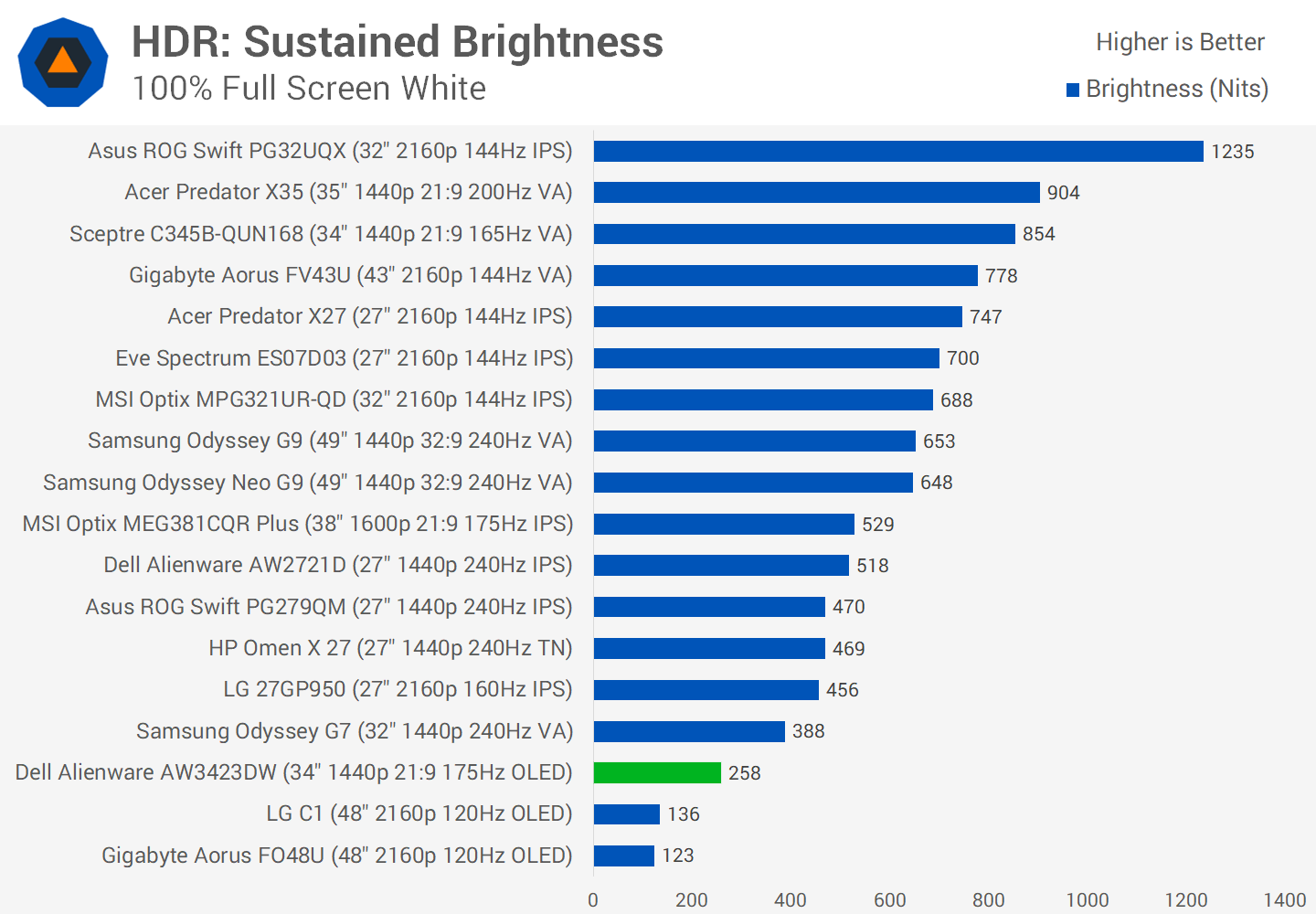 This monitor is significantly better than any 34" ultrawide before it. Previously at the high-end we've had some really good IPS ultrawides without HDR, and a VA model with HDR and a low dimming zone count. This AW3423DW is much better than any of these options for gaming. It's also better than the vast majority of HDR gaming monitors, only falling behind the very best mini-LED LCD panels in brightness.