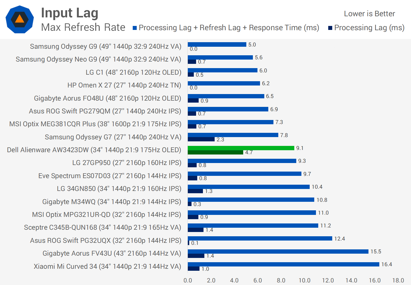 What we found a little puzzling with the AW3423DW was the high level of input latency, in terms of processing delay. Seeing the monitor take nearly 5ms to process is unusual, and while total input latency is okay thanks to a fast refresh rate and lightning fast response times, I think some optimization could be done here to reduce the processing lag.