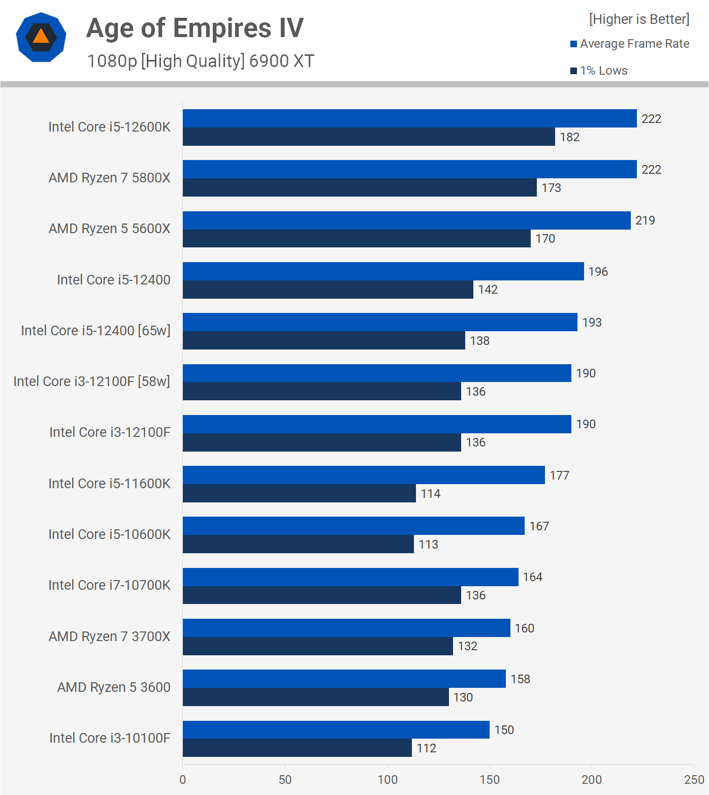 Age of Empires IV relies heavily on single core performance, so the Core i3-12100F does very well allowing for 190 fps on average, which is the same level of performance you'll receive from the i5-12400. It's also a 27% increase from the 10100F and a 20% boost over the Ryzen 5 3600.
