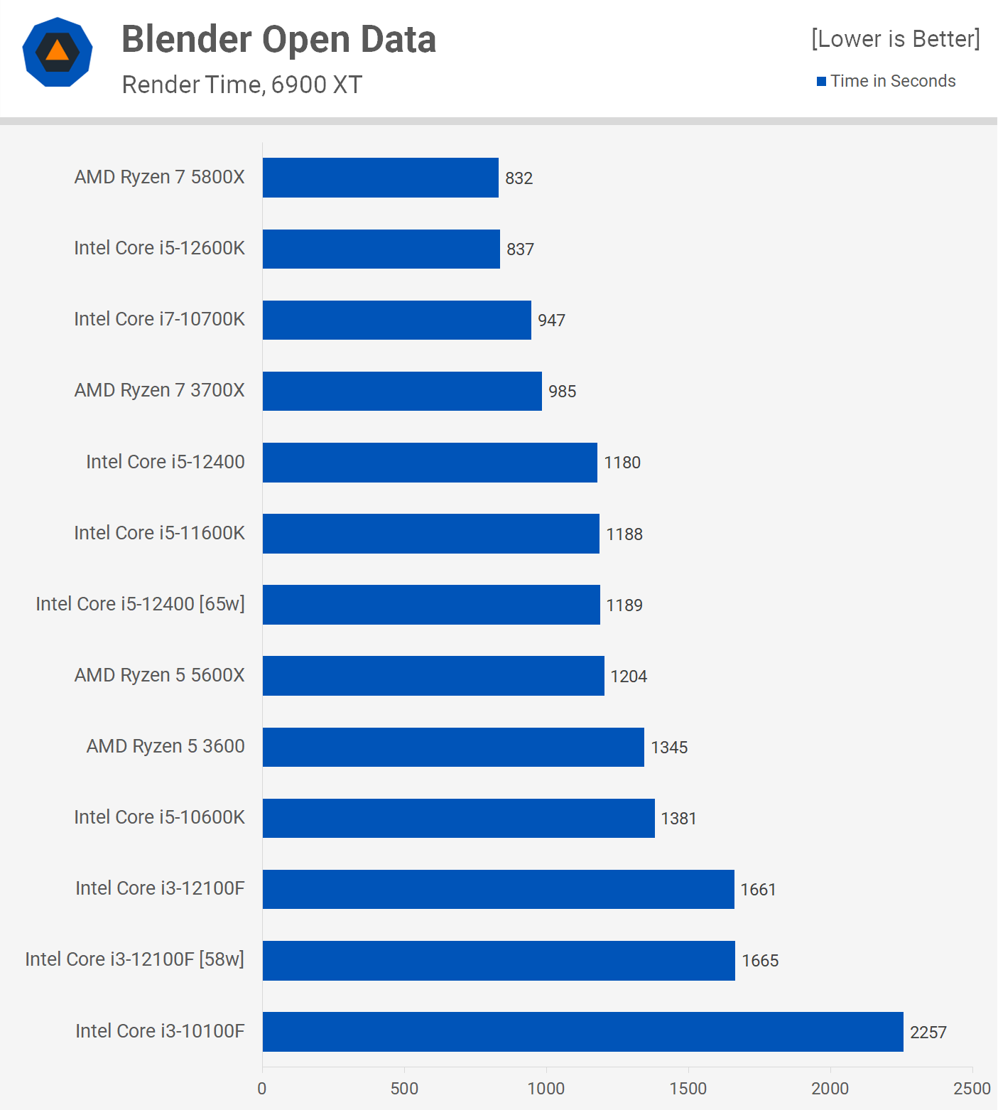 In Blender the margins are fairly similar to what we've already seen. The 12100F reduced the render time by 26% when compared to the 10100F, while it was 21% slower than the 10600K. Essentially you're getting half the performance of the 5800X, while spending 3x less.