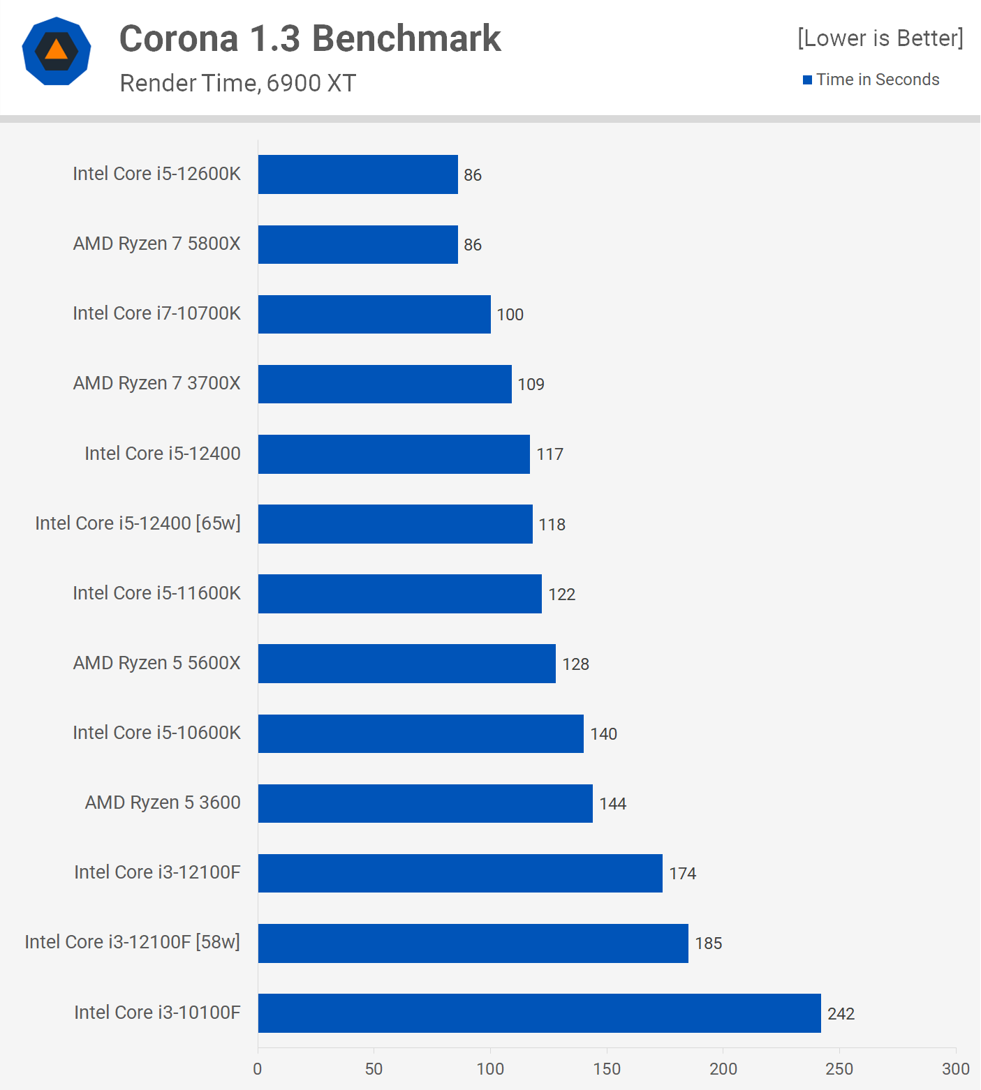 It's also interesting to note that even when limited to the 58w base power spec, the Core i3-1200F delivered basically the same result as the 89w turbo spec, suggesting that this part doesn't use much over 58 watts for its sustained all-core performance. In fact, when monitoring CPU package power we found that the 12100F didn't exceed 57w, at least in this benchmark, so any difference between the two 12100F configurations should be margin of error.