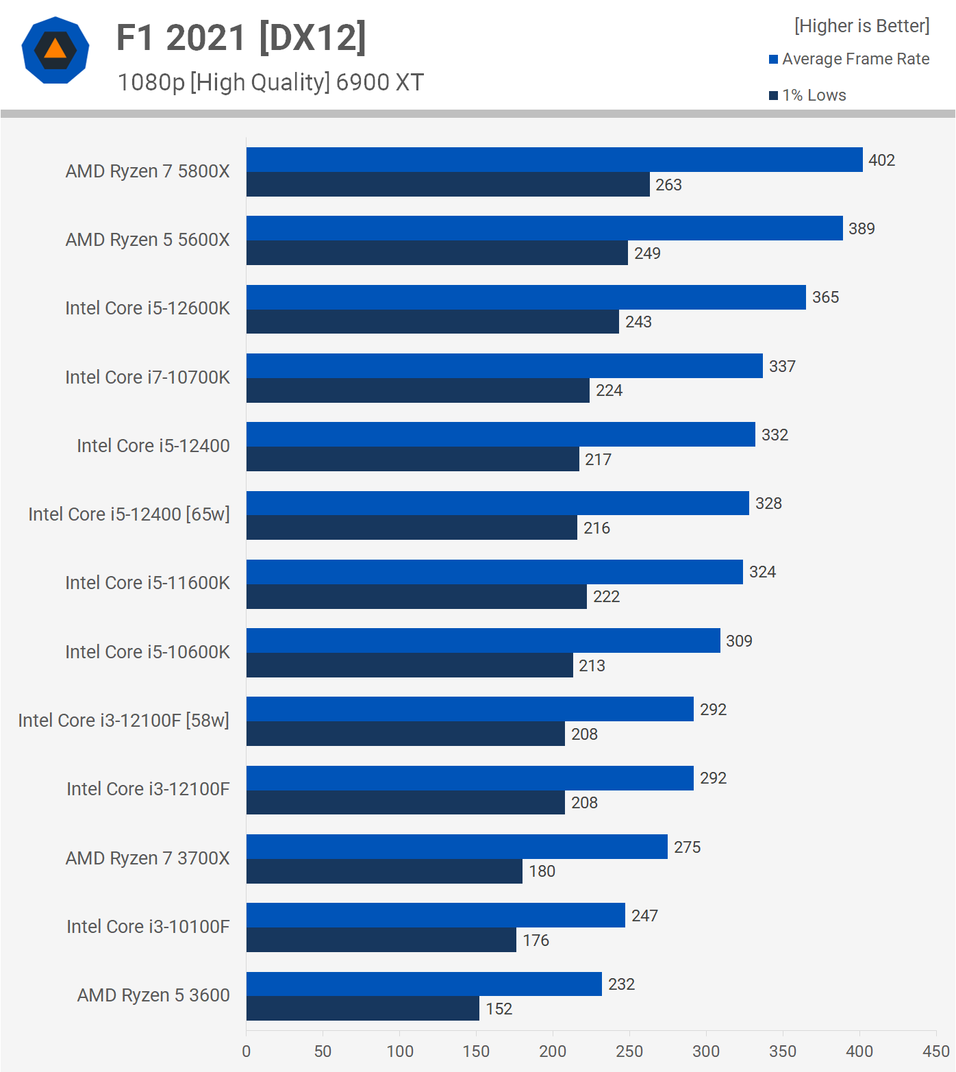 Time to see how this quad-core handles gaming, and we'll start with a relatively easy title. In F1 2021 the 12100F was capable of driving up to 292 fps on average, while keeping 1% lows above 200 fps. Of course, the 10100F was also very capable in F1 2021, but we're looking at an 18% performance uplift.