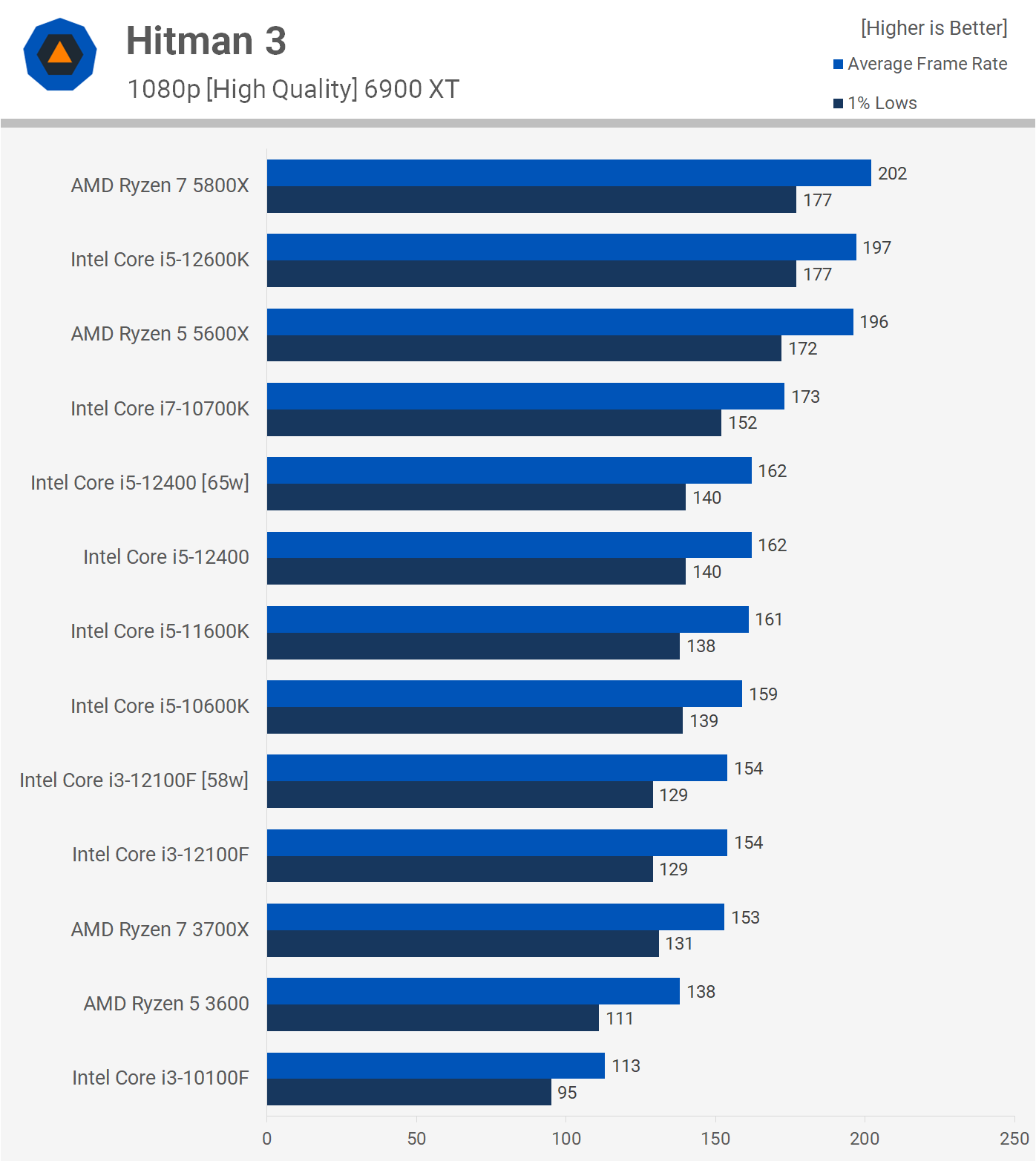 Next we have Hitman 3, and here the 12100F was good for 154 fps on average which is comparable to numerous current and previous generation mid range processors such as the 3700X, 10600K, 11600K, and even the 12400. A strong result and a massive 36% uplift over the old 10100F.