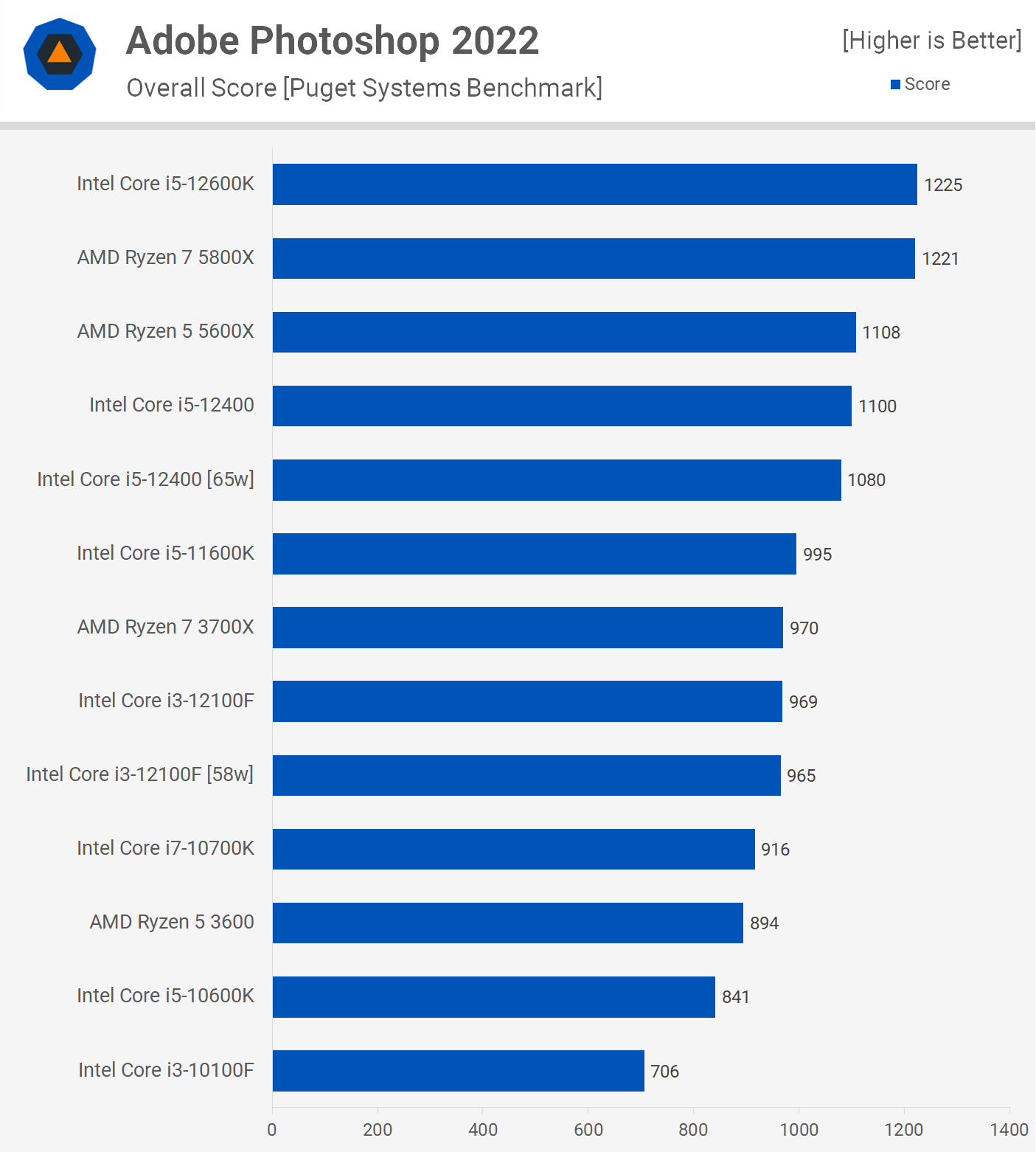 The 12100F is also handy for those needing to get some Photoshop work done as the performance is comparable to that of the 11600K, 3700X and 10700K, some pretty high-end CPUs there in comparison. It was also 37% faster than the 10100F, an impressive jump over the previous-gen Core i3 part.