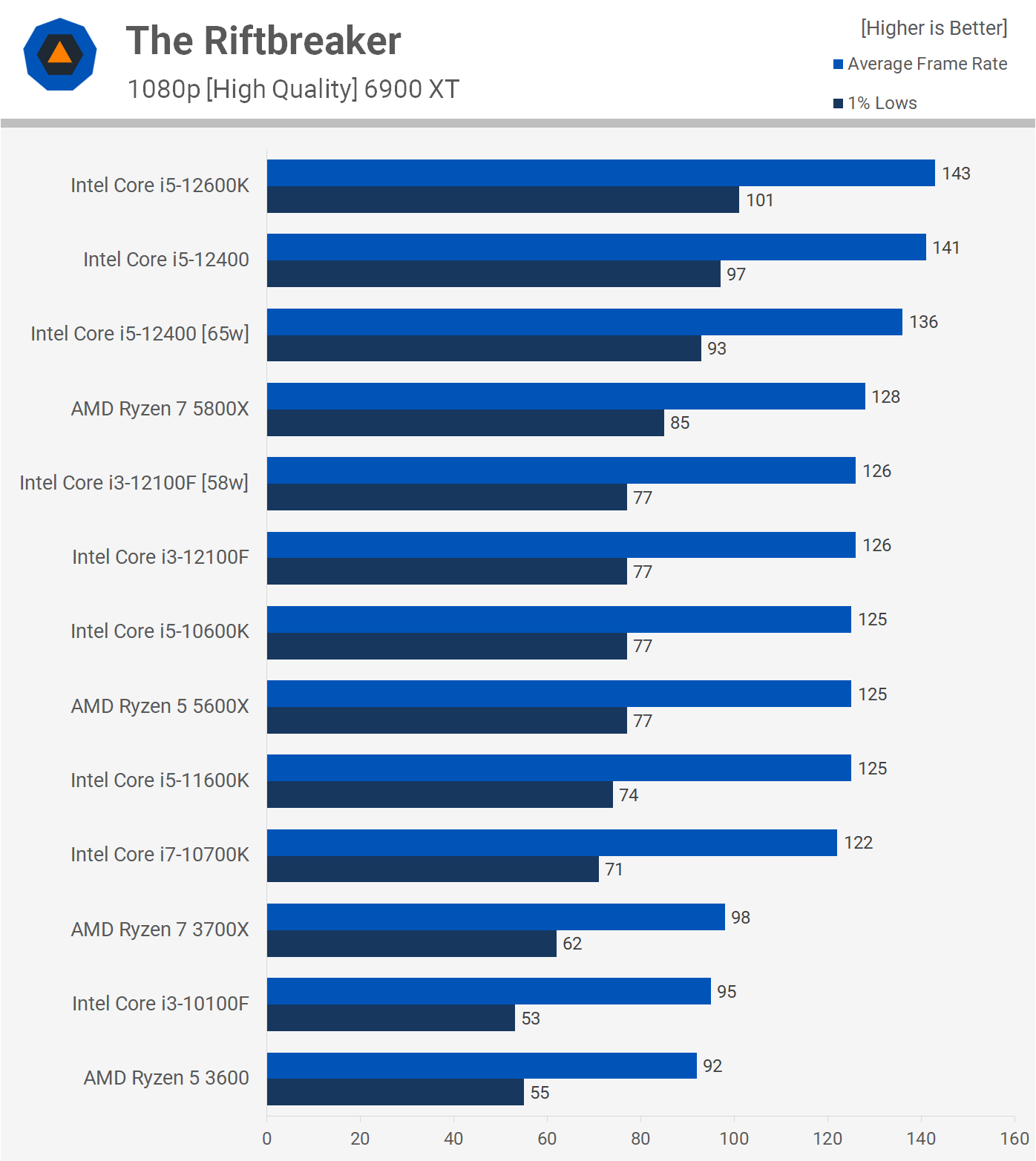 The Riftbreaker is another CPU intensive title, though like most games, single core performance is most important. As a result, the 12100F performs very well allowing for 126 fps on average and that meant it was comparable to the 10600K, 5600X, and 11600K.