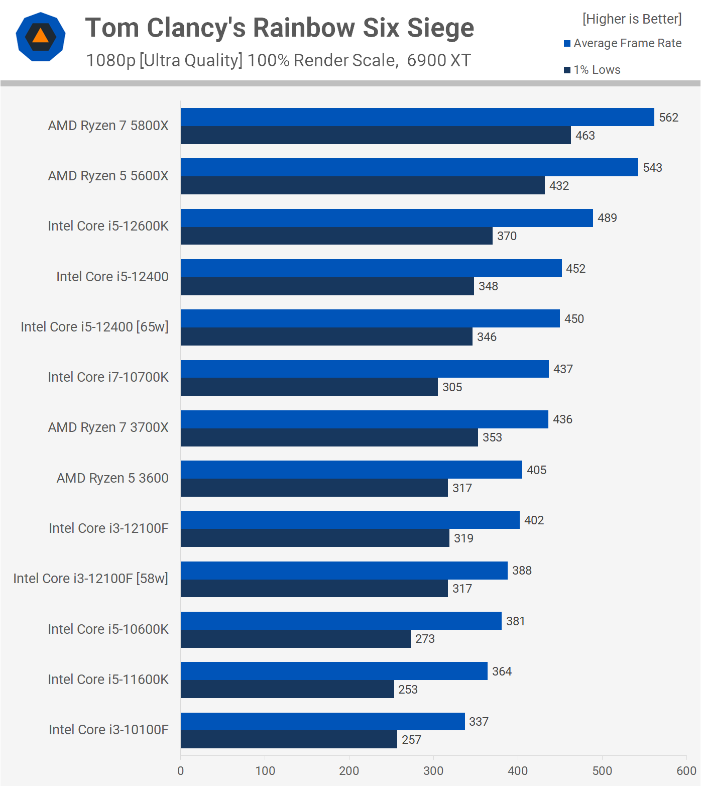 The 12100F was also very capable when testing with Rainbow Six Siege, averaging ~400 fps with 1% lows over 300 fps. This placed it on par with the Ryzen 5 3600 and ahead of both the 11600K and 10600K. When compared to the 10100F, we're seeing a 24% increase in 1% low performance.