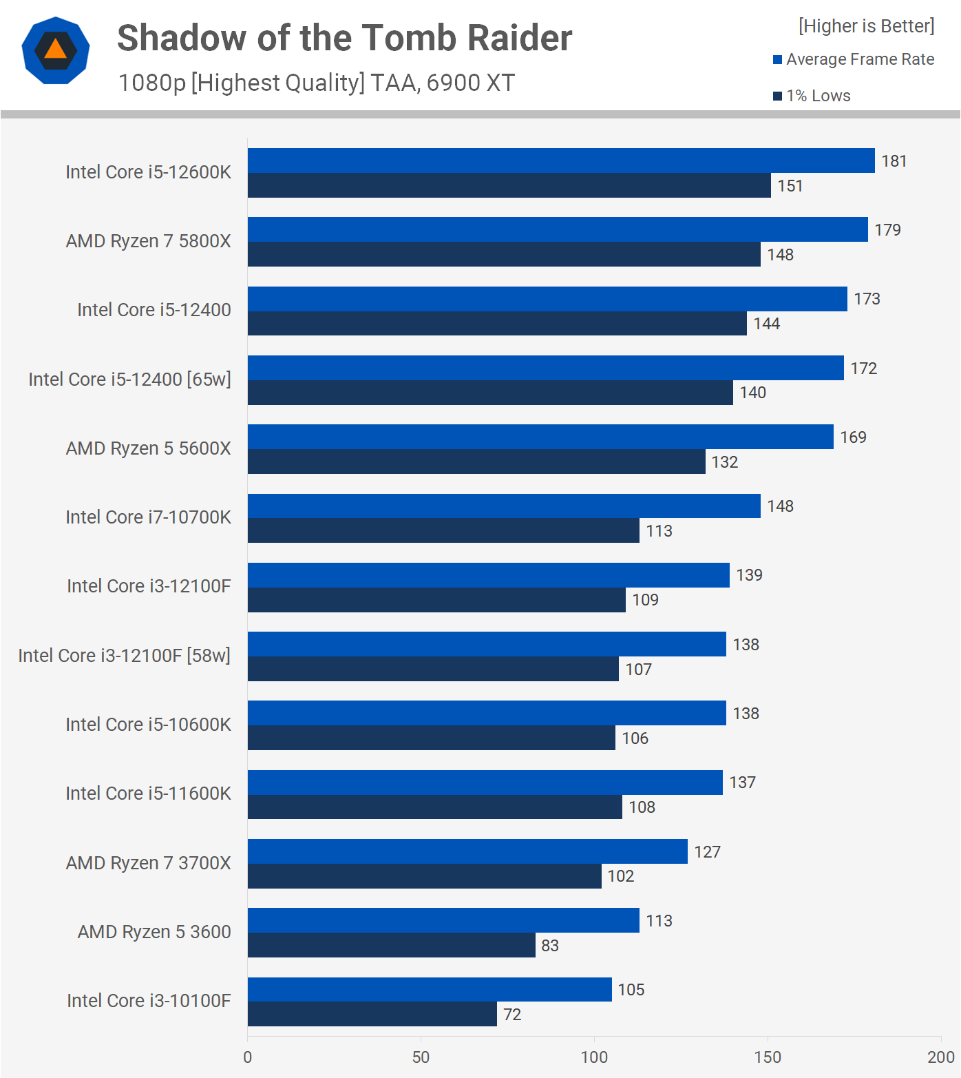 Next we have Shadow of the Tomb Raider and the village section of the game we use for testing is very CPU demanding. I was shocked to discover that the 12100F's 1% low performance was 51% stronger than that of the 10100F and we're also looking at a 32% increase for the average frame rate. When compared to more expensive parts such as the 5600X, the 12100F was just 18% slower and 20% slower than the 12400.